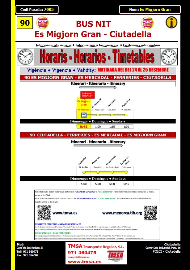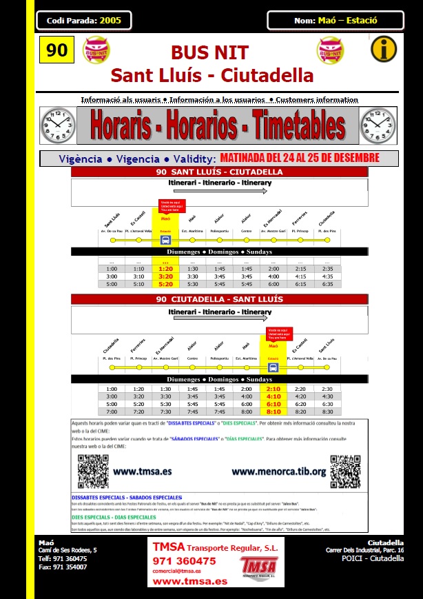 - Maó (Estación Busos): 01.20 - 03.20 - 05.20