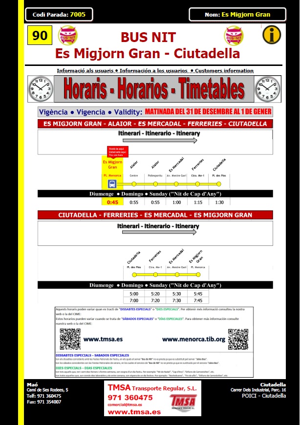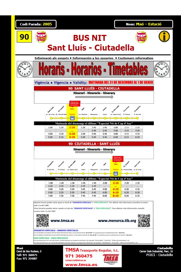 - Maó (Estació d'Autobusos): 01.20 - 03.20 - 05.20