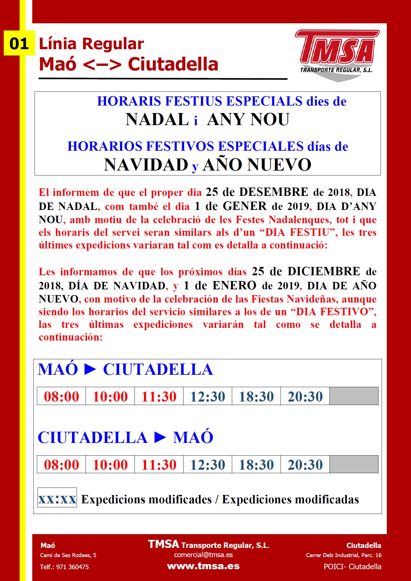 El informem de que el proper dia 25 de DESEMBRE de 2018, com també el dia 1 de GENER de 2019, amb motiu de la celebració de les Festes Nadalenques, tot i que els horaris del servei seran similars als d’un “DIA FESTIU”, algunes expedicions patiran canvis en els seus horaris.