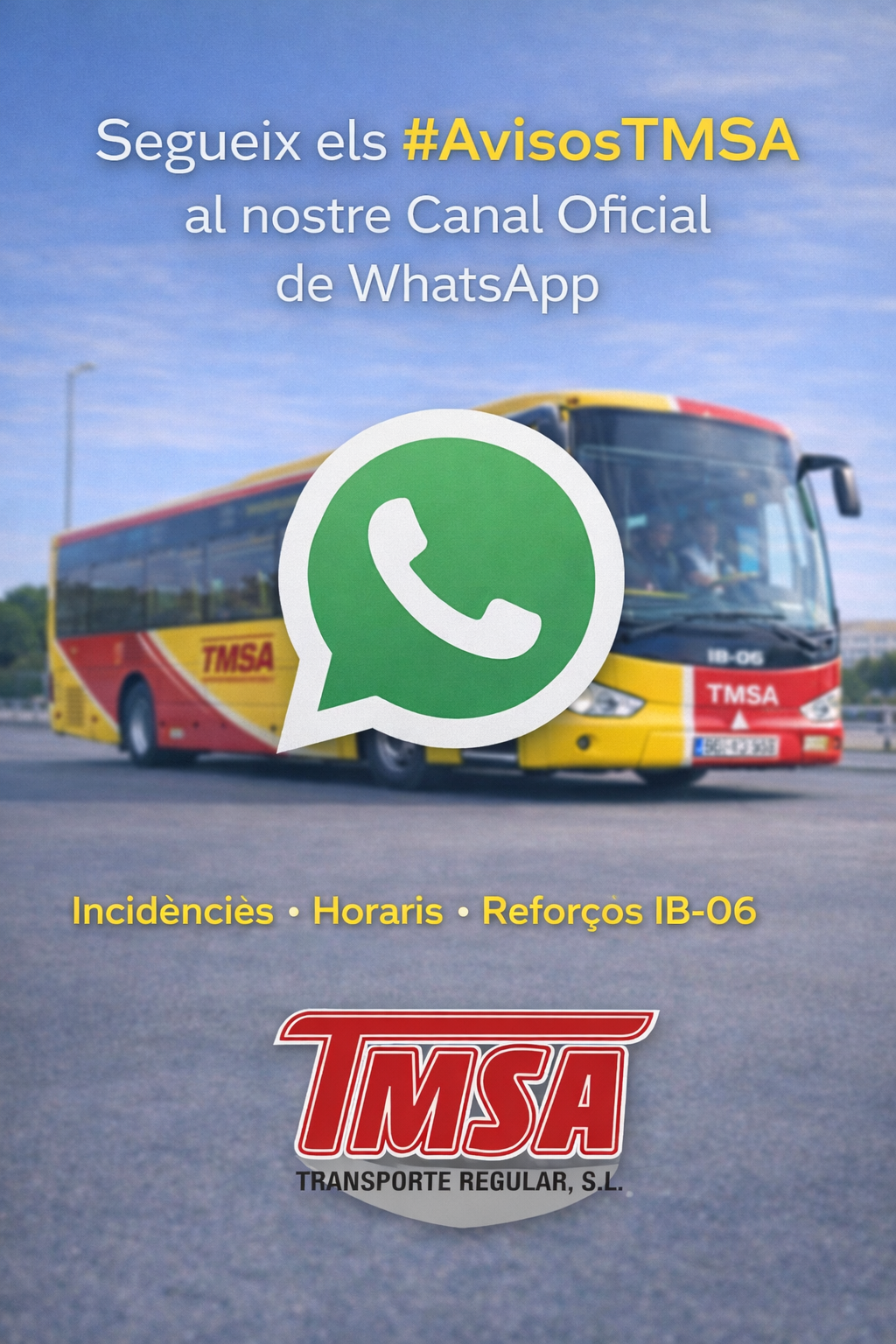 Pots seguir tots els #AvisosTMSA a través del nostre Canal Oficial de WhatsApp, on publicarem incidències, modificacions d’horaris, reforços puntuals i comunicacions rellevants de les línies IB-06.