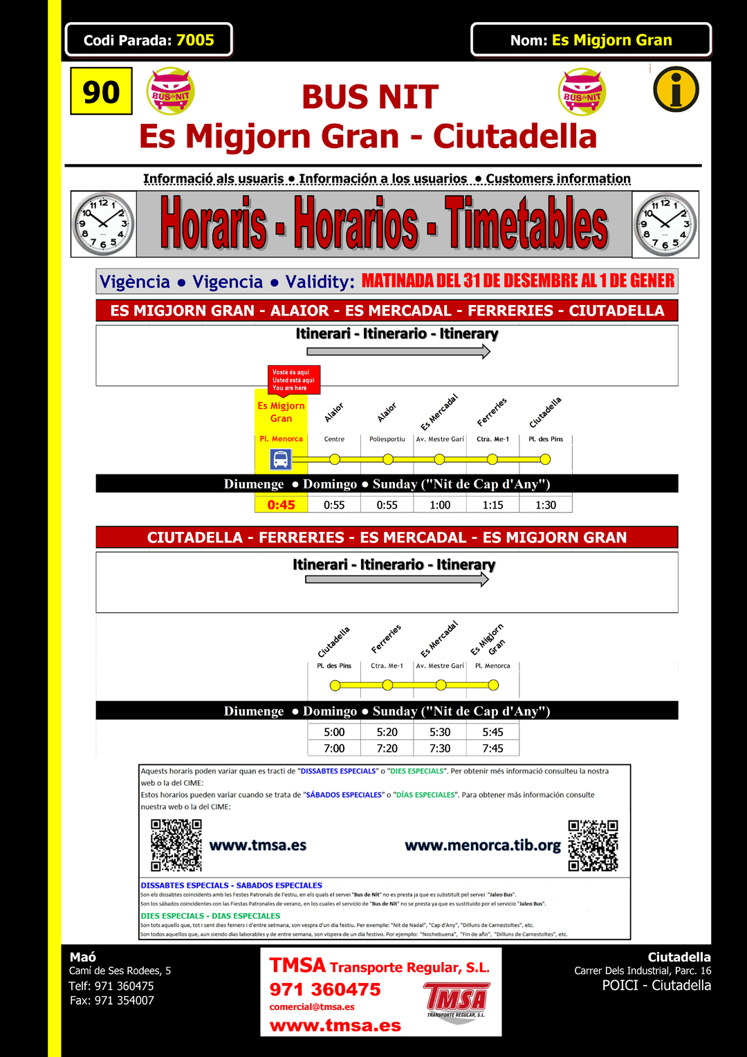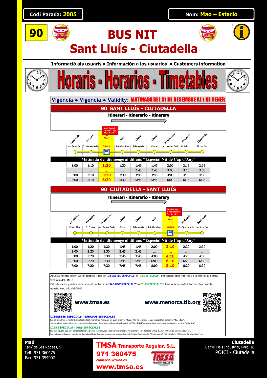 - Maó (Estación de Autobusos): 01.20 - 03.20 - 05.20