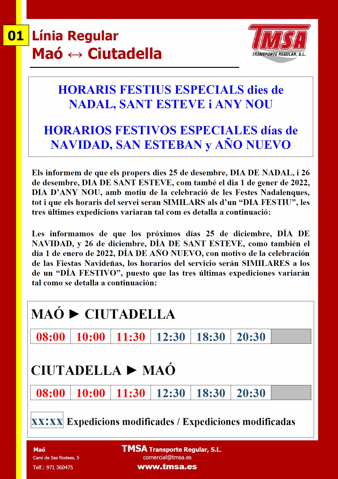 lgunas de las líneas que ya estaban operativas, pueden ver modificados los horarios de algunas de sus expediciones, como ocurre en las líneas L03 Maó – Sant Lluís, L21 Maó – Sant Climent, L31 Maó – Cala en Porter, L51 Maó - Cala Galdana, L52 Ciutadella - Cala Galdana, L73 Maó – Es Migjorn Gran, L91 Maó – Alcalfar – S’Algar y L92 Maó – Sant Lluís – Punta Prima.