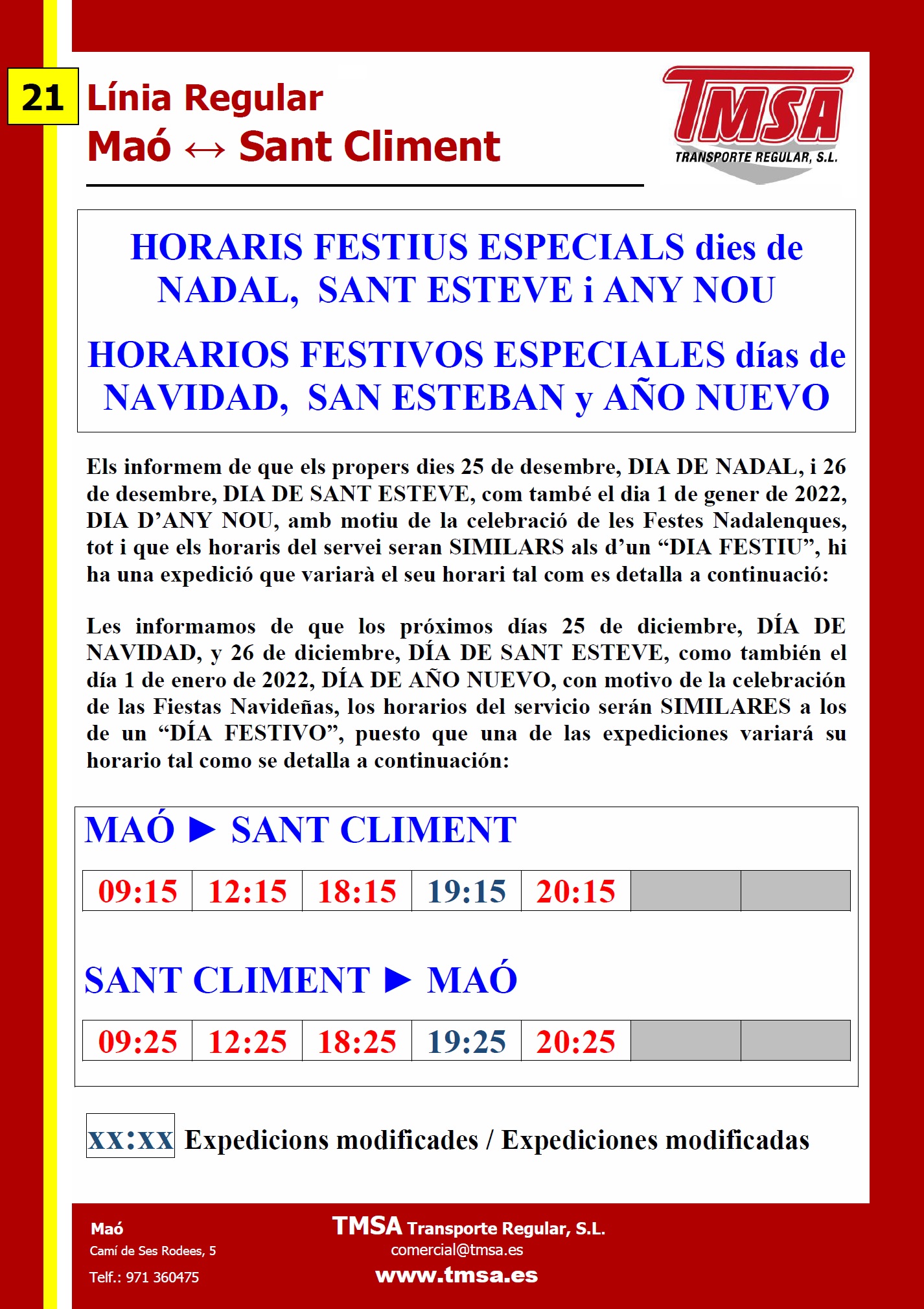 Les informamos de que a partir del próximo jueves 23 de DICIEMBRE de 2021 y hasta el próximo domingo 9 de ENERO de 2022, ambos inclusive, durante los Días LABORABLES NO LECTIVOS (período de vacaciones de Navidad en los centros de enseñanza), la línea L33 Alaior - Cala en Porter no prestará servicio.