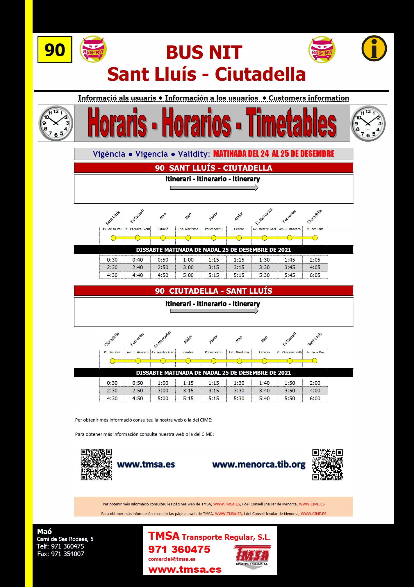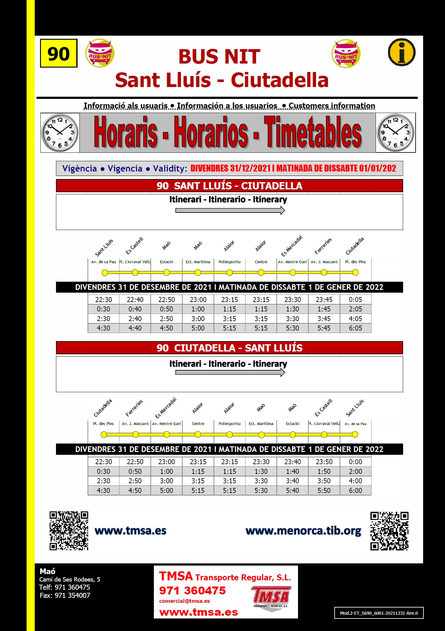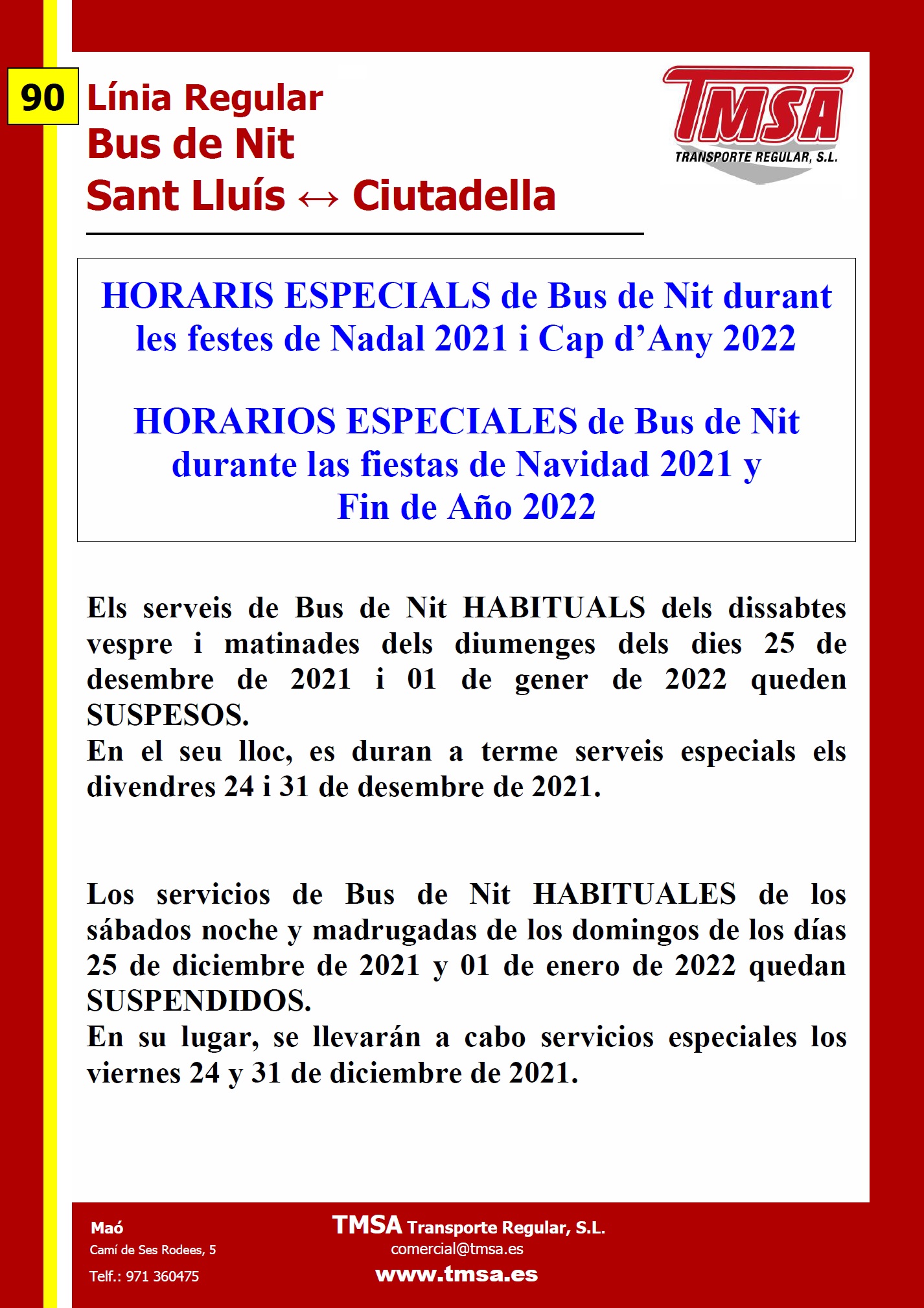 Horario especial de la línea L90 Bus de Nit Sant Lluís - Ciutadella para la noche del 31 de diciembre de 2021 y la madrugada del 01 de enero de 2022.