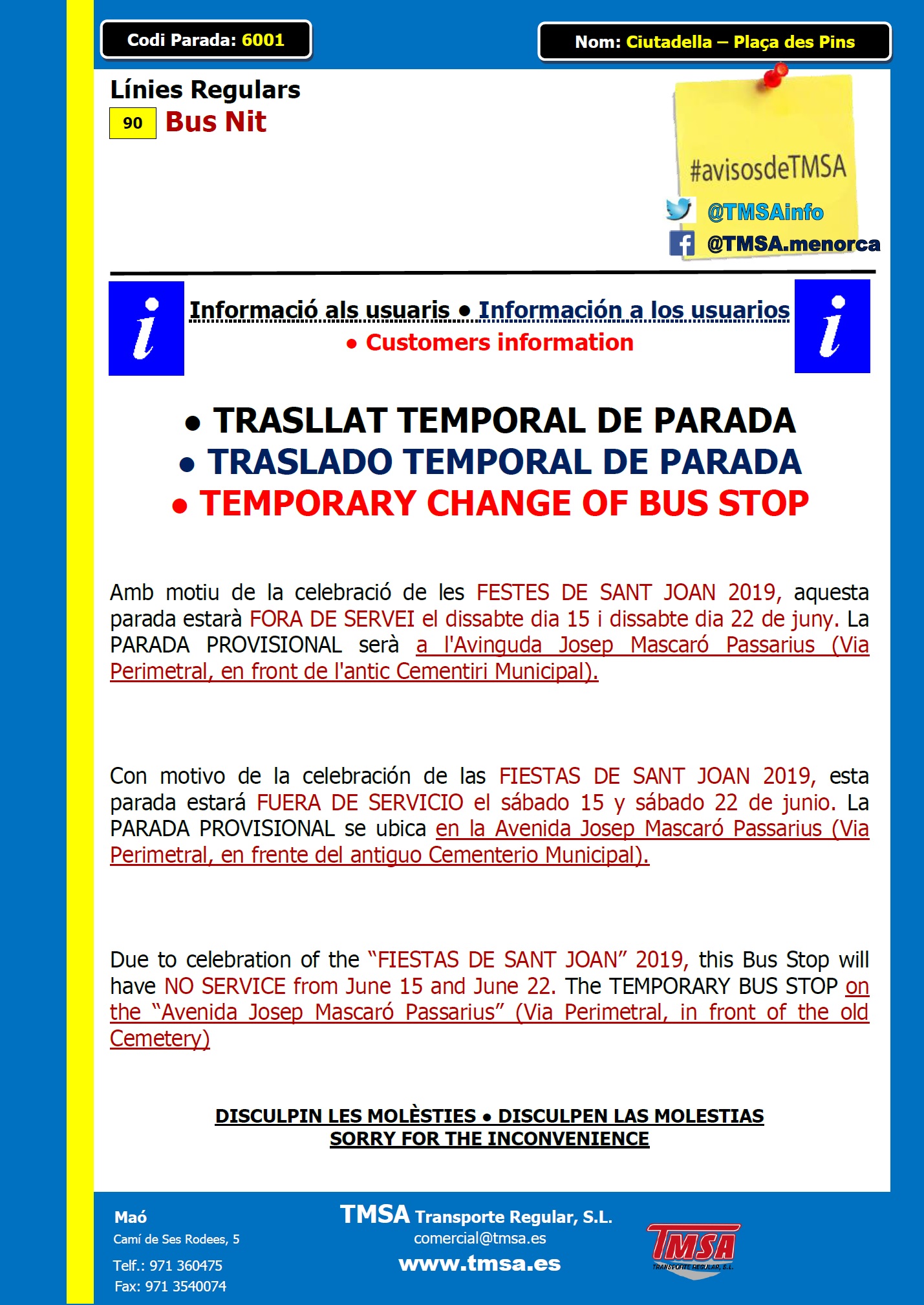 Con motivo de la celebración de las FIESTAS DE SANT JOAN 2019, esta parada estará FUERA DE SERVICIO desde el día 21 hasta el día 25 de junio, ambos incluidos. Todos los autobuses con destino a: Maó, Ferreries, Es Mercadal, Alaior y a urbanizaciones de Son Bou, Sant Tomàs y Cala Galdana, tendrán la llegada y la salida en la PARADA VIA PERIMETRAL (Avenida Josep Mascaró Passarius, en frente del antiguo Cementerio Municipal). Disculpen las molestias.