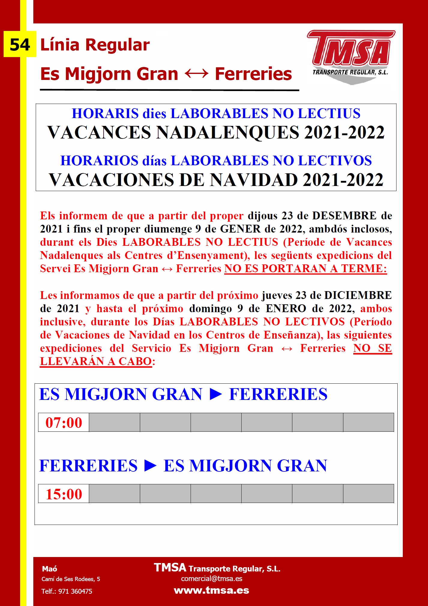 Les informamos de que a partir del próximo jueves 23 de DICIEMBRE de 2021 y hasta el próximo dominto 9 de ENERO de 2022, ambos inclusive, durante los Días LABORABLES NO LECTIVOS (período de vacaciones de Navidad en los centros de enseñanza), la línea L54 Es Migjorn Gran - Ferreries no prestará servicio.