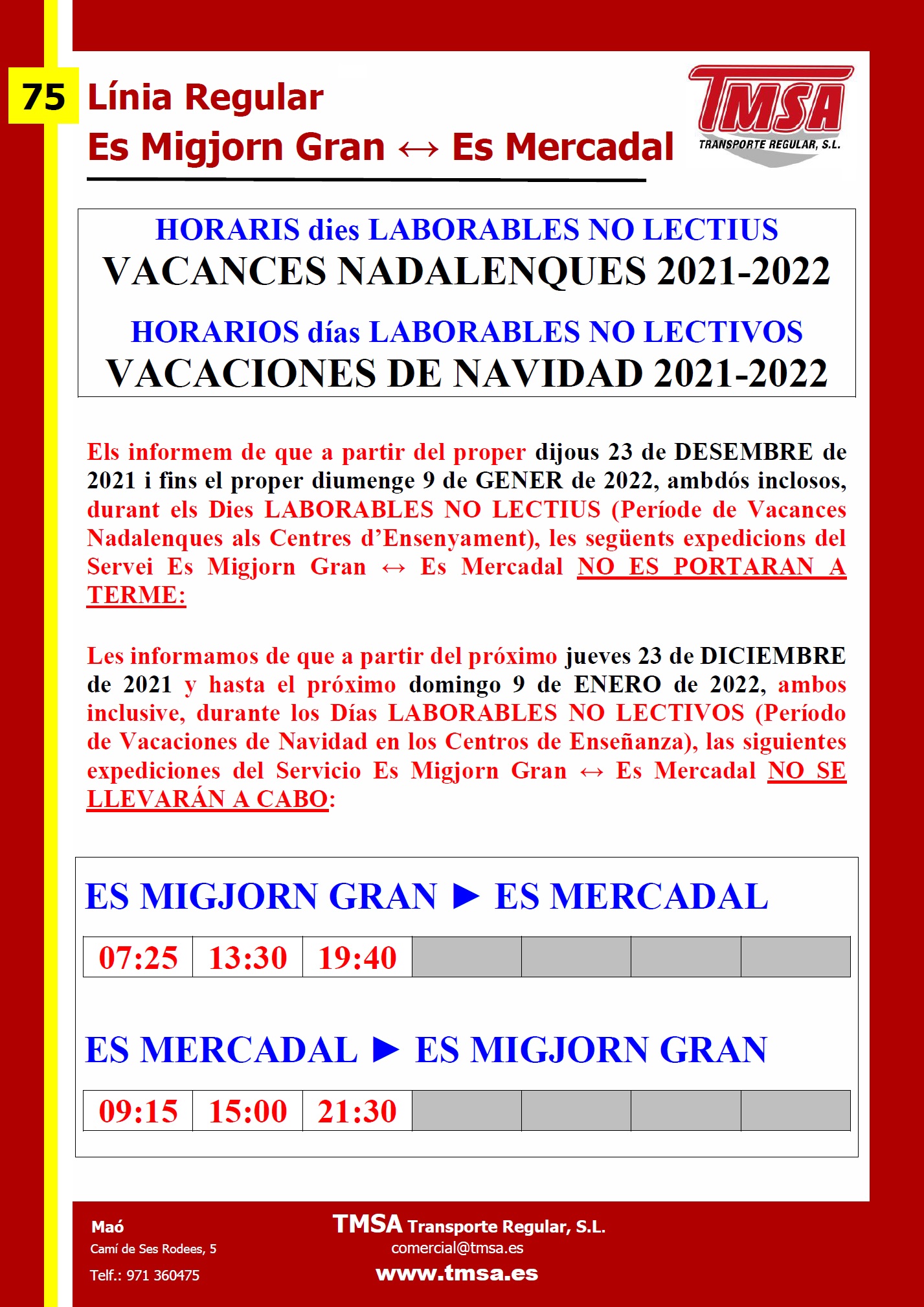 Les informamos de que a partir del próximo jueves 23 de DICIEMBRE de 2021 y hasta el próximo domingo 9 de ENERO de 2022, ambos inclusive, durante los Días LABORABLES NO LECTIVOS (período de vacaciones de Navidad en los centros de enseñanza), la línea L75 Es Migjorn Gran - Es Mercadal no prestará servicio.
