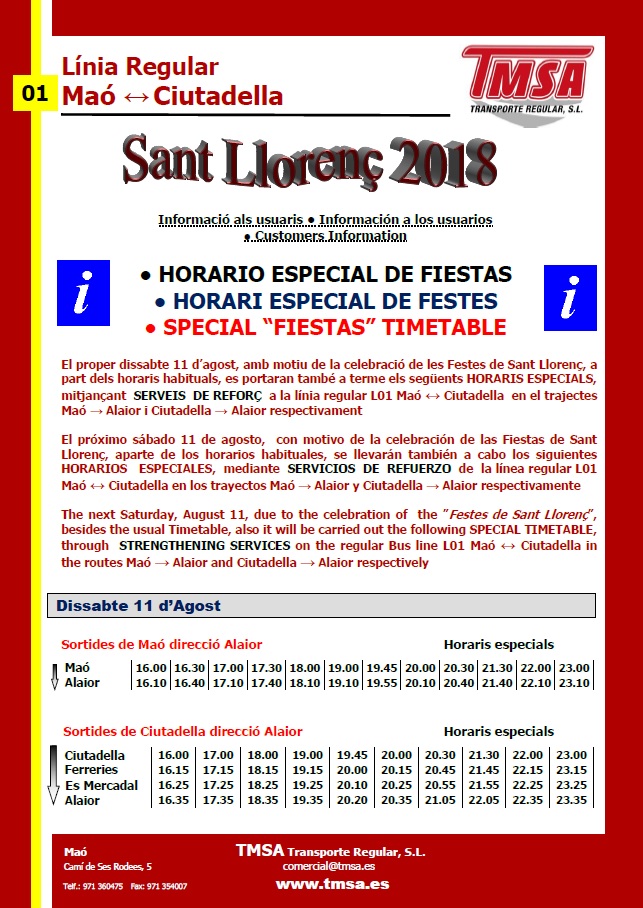 The next Saturday, August 11, due to the celebration of  the ”Festes de Sant Llorenç”, besides the usual Timetable, also it will be carried out the following SPECIAL TIMETABLE, through STRENGTHENING SERVICES  on  the regular  Bus line  L01 Maó <---> Ciutadella in the routes Maó ---> Alaior and Ciutadella ---> Alaior respectively