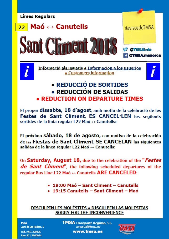The next Saturday, August 18, due to the celebration of  the ”Festes de Sant Climent”, besides the usual Timetable, also it will be  carried  out  the  following  SPECIAL TIMETABLE, through  STRENGTHENING  SERVICES  on  the regular Bus  line L21  Maó ---> Sant Climent