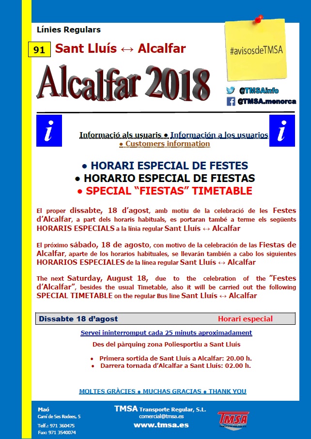 The next Saturday, August 18, due to the celebration of  the ”Festes de Alcalfar”, besides the usual Timetable, also it will be carried out the following  SPECIAL TIMETABLE on the regular Bus line Sant Lluís <-> Alcalfar