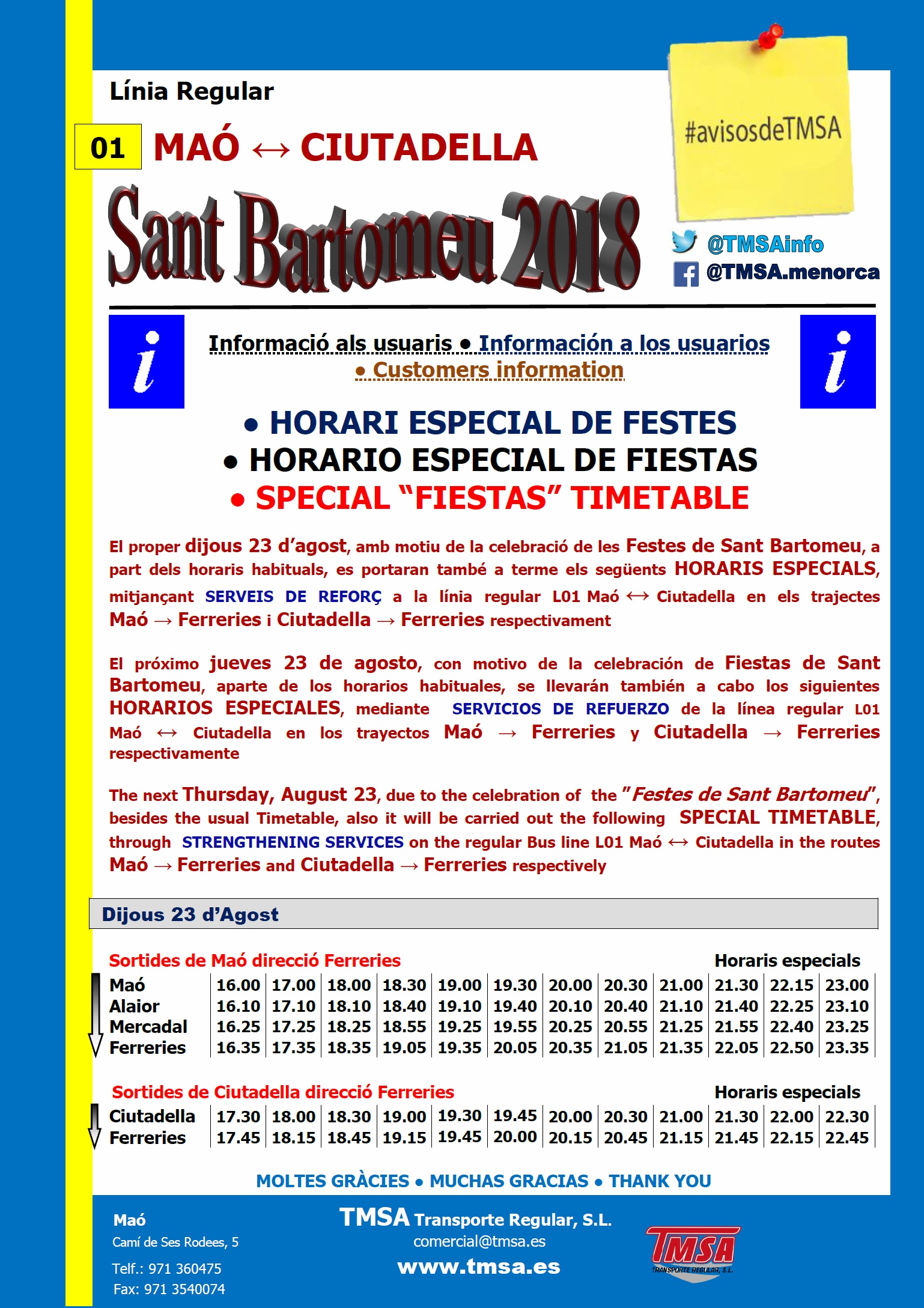 The next Thursday, August 23, due to the celebration of  the ”Festes de Sant Bartomeu”, besides the usual Timetable, also it will be carried out the following  SPECIAL TIMETABLE, through  STRENGTHENING SERVICES on the regular Bus line L01 Maó <-> Ciutadella in the routes Maó ---> Ferreries and Ciutadella ---> Ferreries respectively