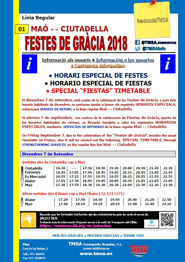 Next Friday, September 7, due to the celebration of  the ”Festes de Gràcia”, besides the usual Timetable on Friday, also it will be carried out the following SPECIAL TIMETABLE, through STRENGTHENING SERVICES  on  the  regular  Bus  line  L01  Maó <--> Ciutadella