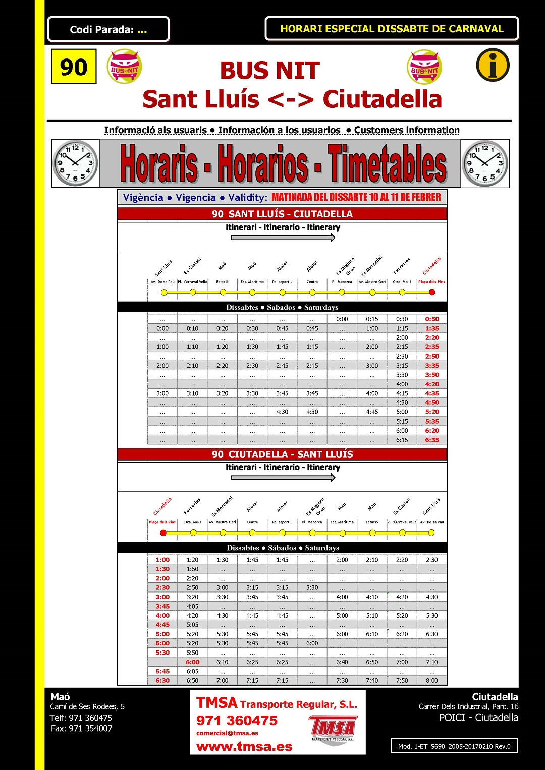 Les informamos de que a partir del día 17-2-2018 la línea L-92 Maó-Sant Lluis-Punta Prima se habilita parcialmente hasta Biniancolla con la entrada en vigor de las siguientes salidas hasta/desde el Hotel Sur Menorca:
