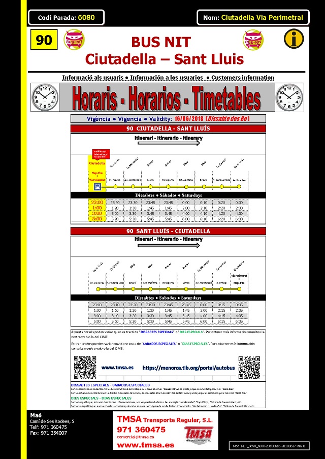 ALL SERVICE Timetables for Tuesday May 1, will be those of a PUBLIC HOLIDAY. And that some of the routes that were already operational, may undergo changes in the schedules of some of their expeditions, as in the routes L03 Maó – Sant Lluís, L21 Maó – Sant Climent, L31 Maó – Cala en Porter, L73 Maó – Es Migjorn Gran, L91 Maó – Alcalfar – S’Algar y L92 Maó – Sant Lluís – Punta Prima.