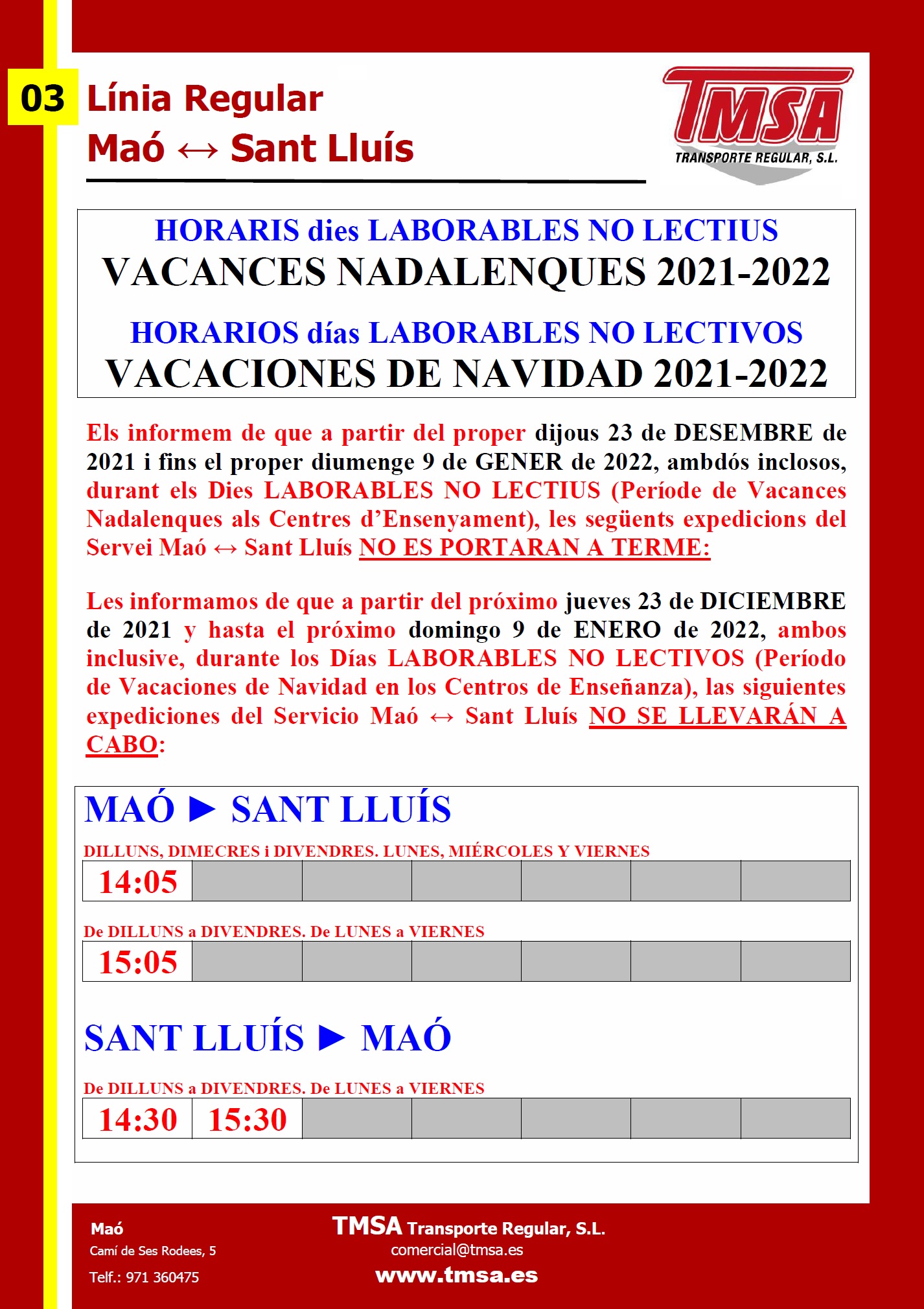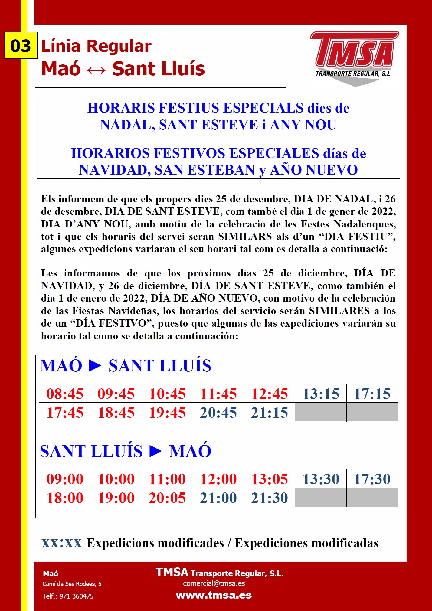 - L03 Maó - Sant Lluís, se añaden dos nuevas expediciones, una en cada sentido, que solo se prestarán de Lunes a Viernes DIAS LECTIVOS.