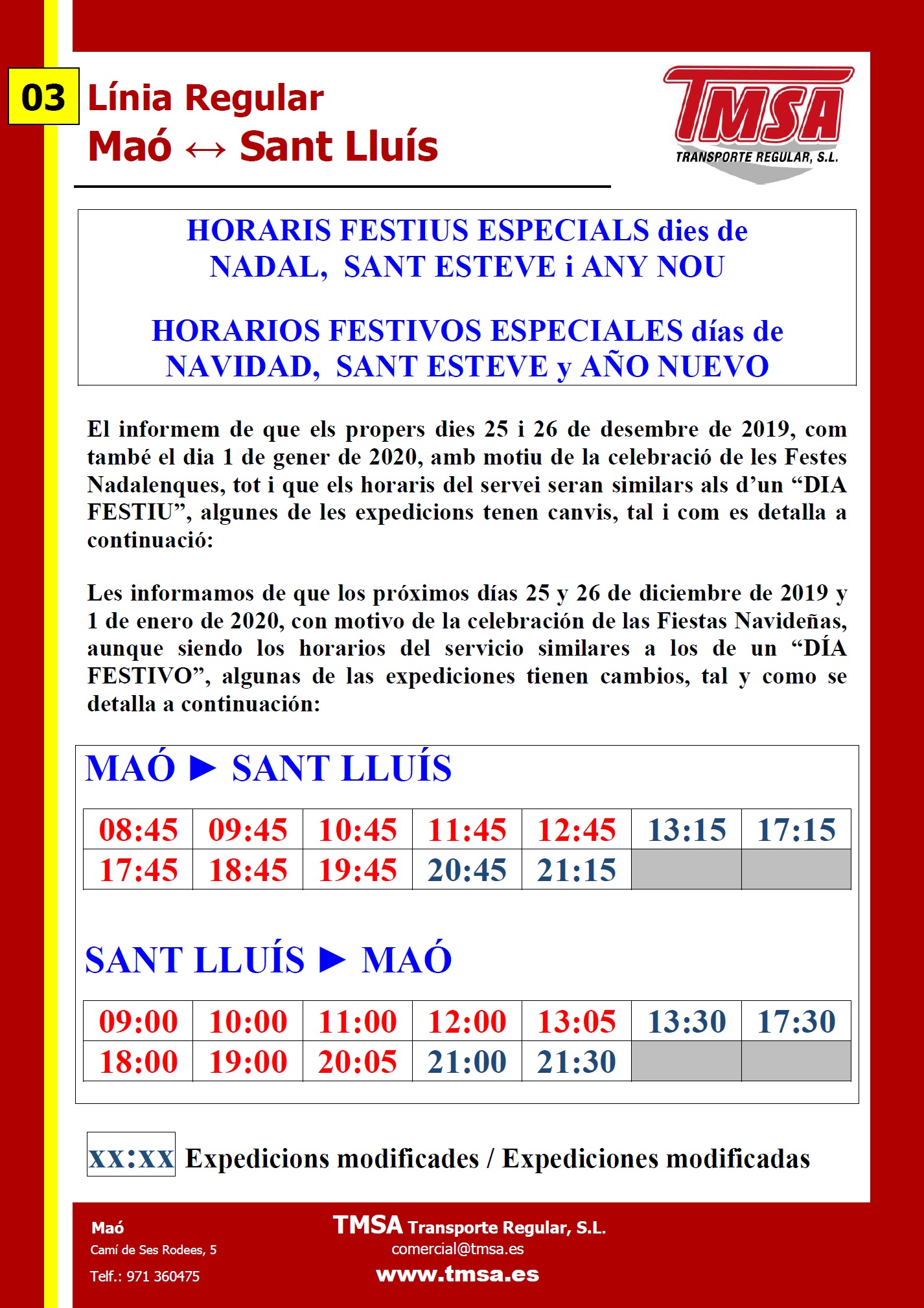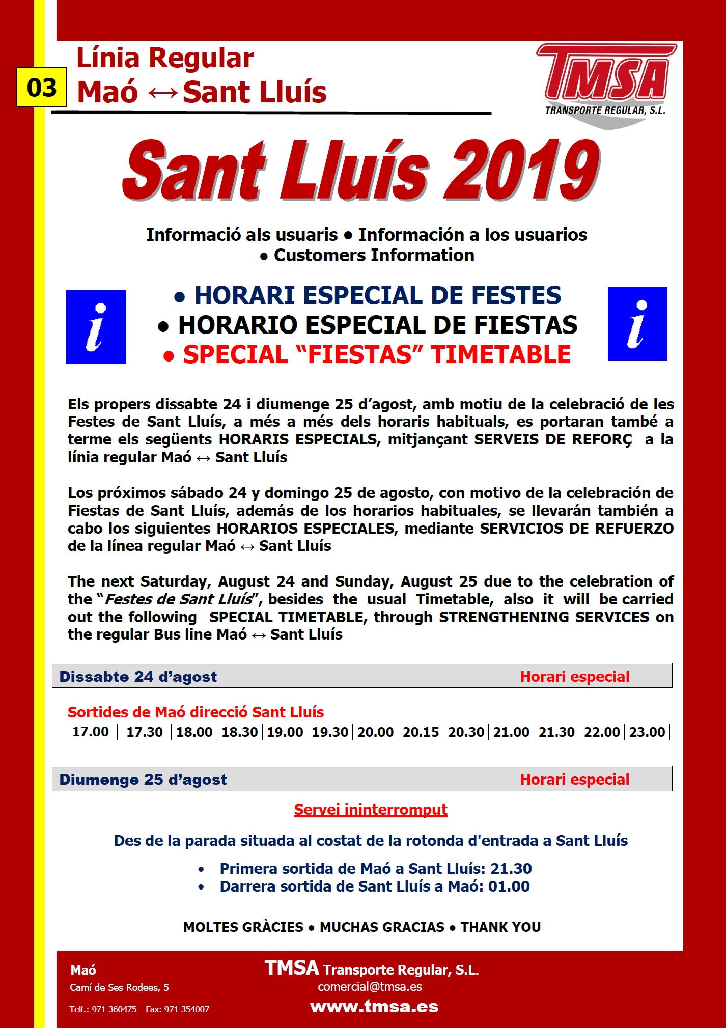 Los próximos sábado 24 y domingo 25 de agosto, con motivo de la celebración de Fiestas de Sant Lluís, además de los horarios habituales, se llevarán también a cabo los siguientes HORARIOS ESPECIALES, mediante SERVICIOS DE REFUERZO de la línea regular Maó <--> Sant Lluís.