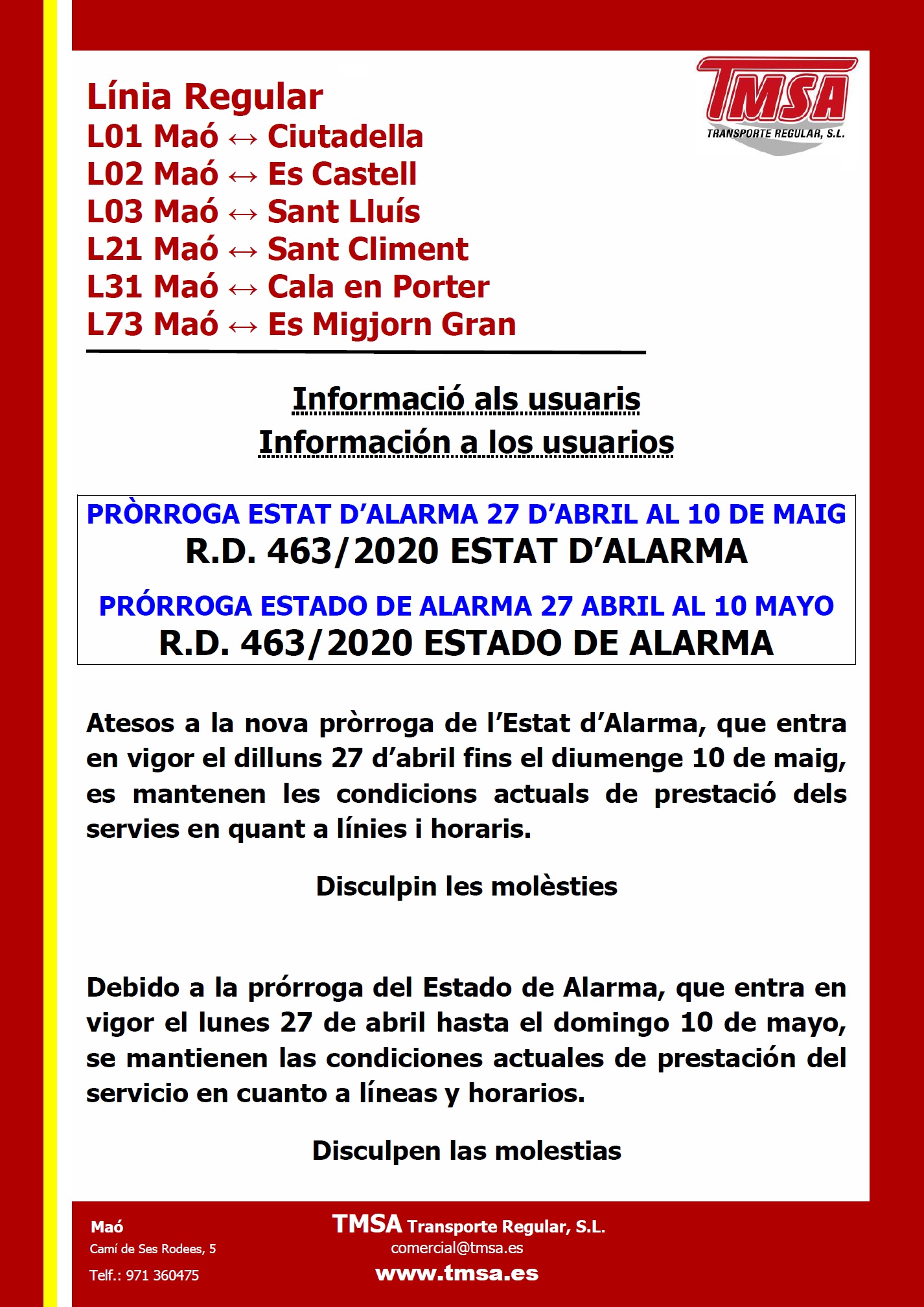 Debido al Real Decreto 463/2020, del 14 de marzo, que declara el estado de alarma para la gestión de la situación de la crisis sanitaria ocasionada por el COVD-19, se informa de la reducción de frecuencias en todas nuestras líneas y también la supresión de la prestación del servicio de la línea L90, que se llevaran a cabo a partir del miércoles 18 de marzo hasta la vigencia del Real Decreto.