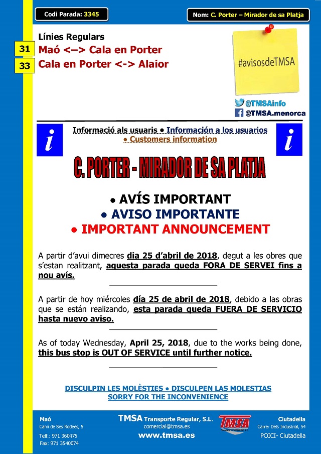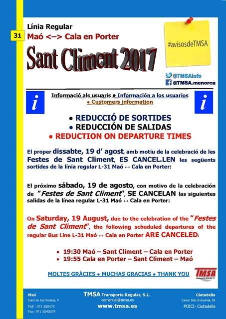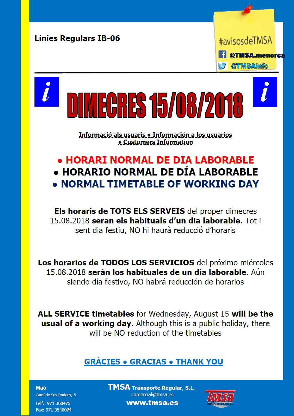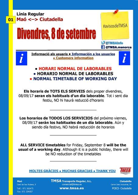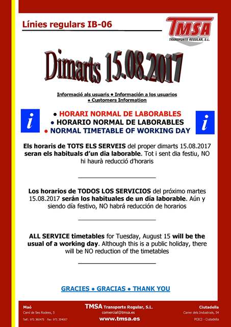 Recordaros que para TODOS LOS SERVICIOS mañana martes 1 de mayo, todos los horarios serán los correspondientes a DÍA FESTIVO. Y que algunas de las líneas que ya estaban operativas, pueden sufrir cambios en los horarios de algunas de sus expediciones, como ocurre en las líneas L03 Maó – Sant Lluís, L21 Maó – Sant Climent, L31 Maó – Cala en Porter, L73 Maó – Es Migjorn Gran, L91 Maó – Alcalfar – S’Algar y L92 Maó – Sant Lluís – Punta Prima.