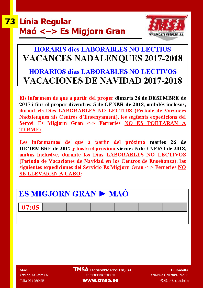 Recordaros que para TODOS LOS SERVICIOS mañana martes 1 de mayo, todos los horarios serán los correspondientes a DÍA FESTIVO. Y que algunas de las líneas que ya estaban operativas, pueden sufrir cambios en los horarios de algunas de sus expediciones, como ocurre en las líneas L03 Maó – Sant Lluís, L21 Maó – Sant Climent, L31 Maó – Cala en Porter, L73 Maó – Es Migjorn Gran, L91 Maó – Alcalfar – S’Algar y L92 Maó – Sant Lluís – Punta Prima.