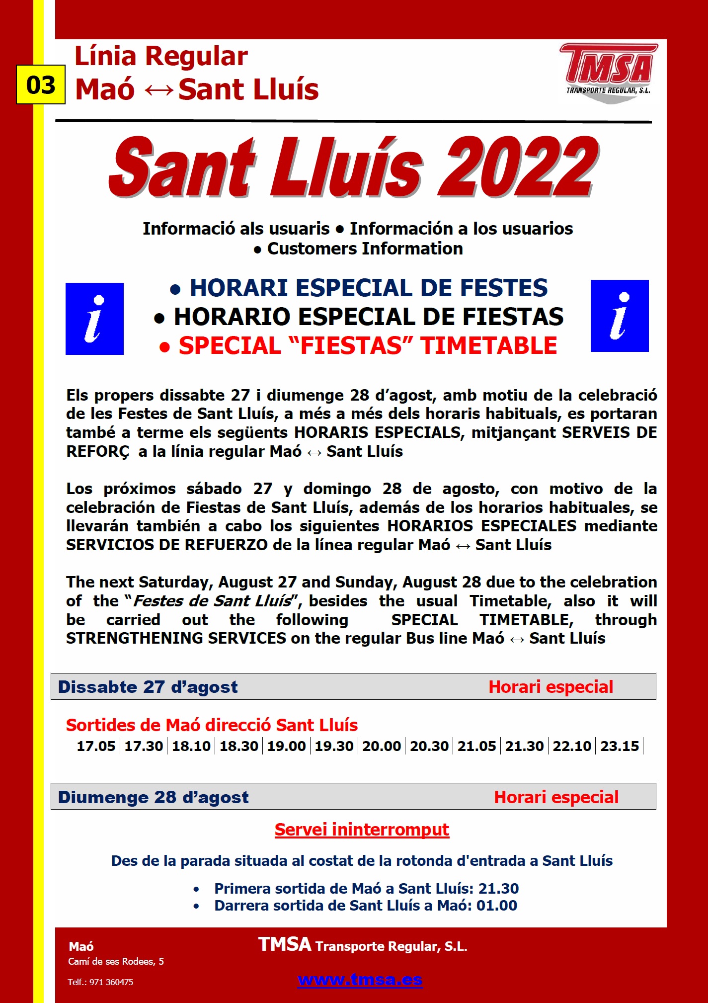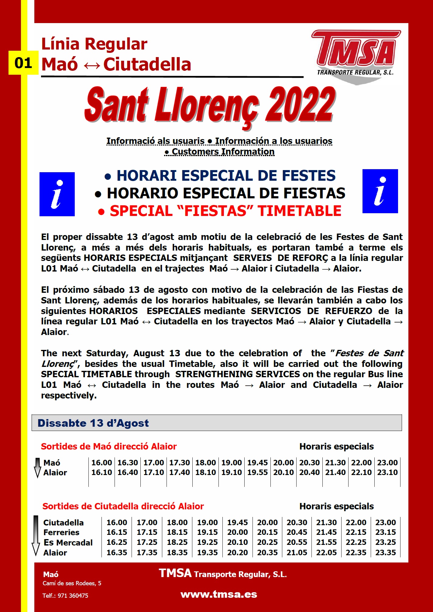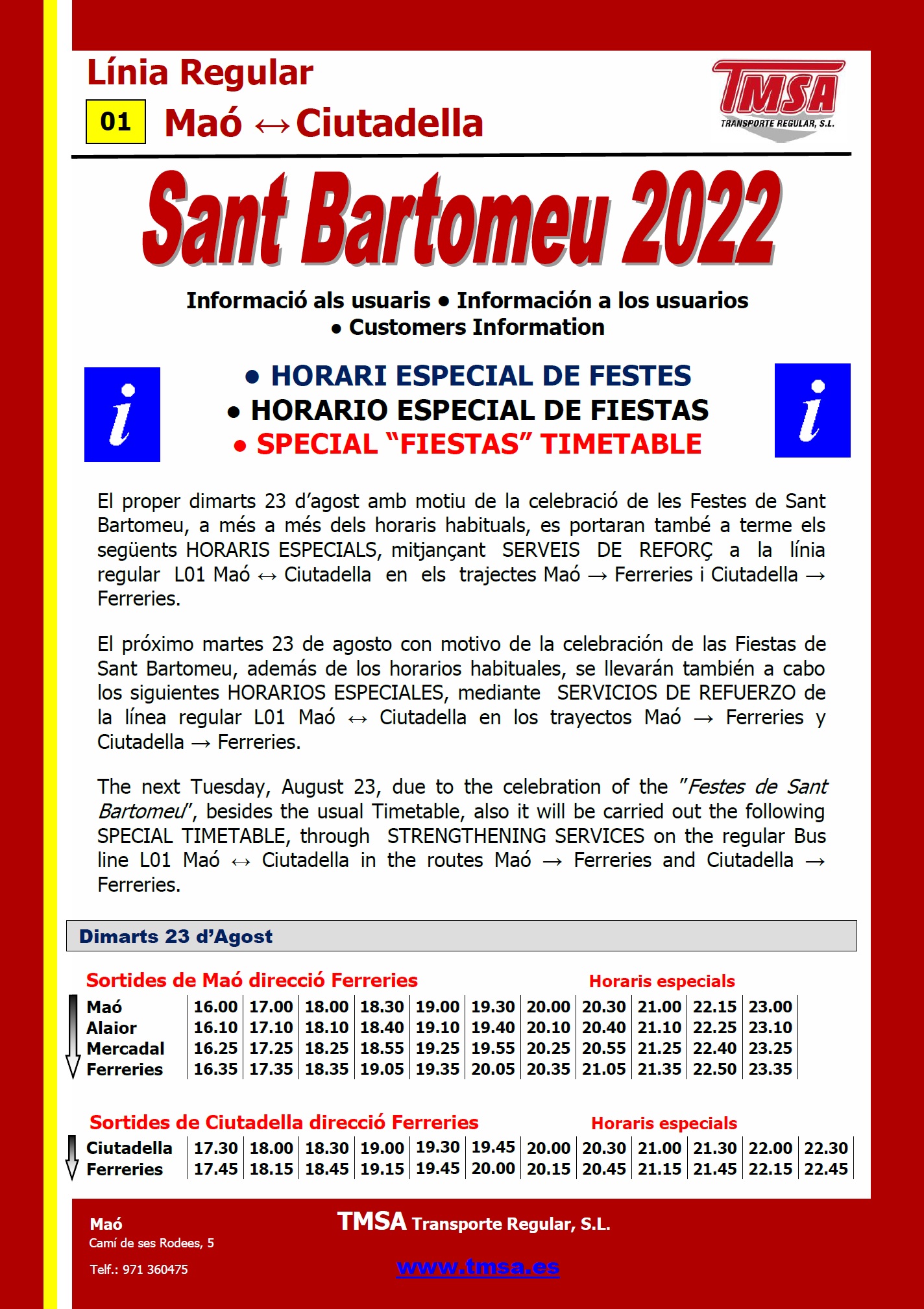 El próximo martes 23 de agosto con motivo de la celebración de las Fiestas de Sant Bartomeu, además de los horarios habituales, se llevarán también a cabo los siguientes HORARIOS ESPECIALES, mediante SERVICIOS DE REFUERZO de la línea regular L01 Maó <---> Ciutadella en los trayectos Maó ---> Ferreries y Ciutadella ---> Ferreries.