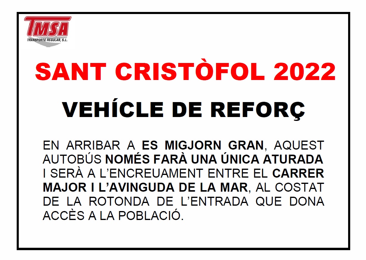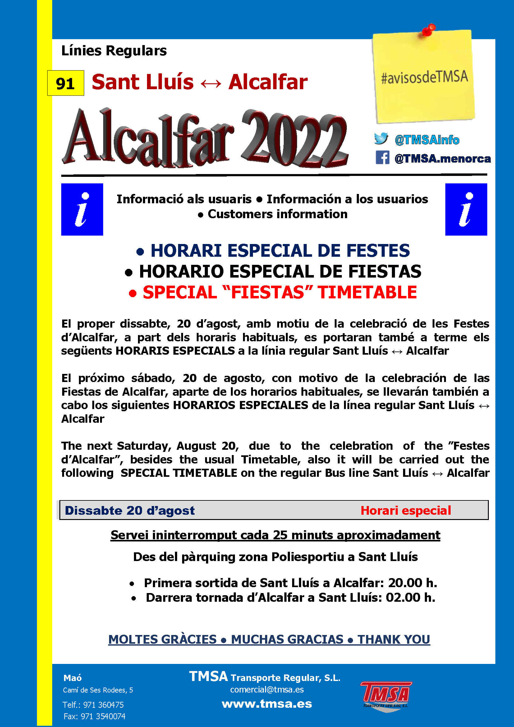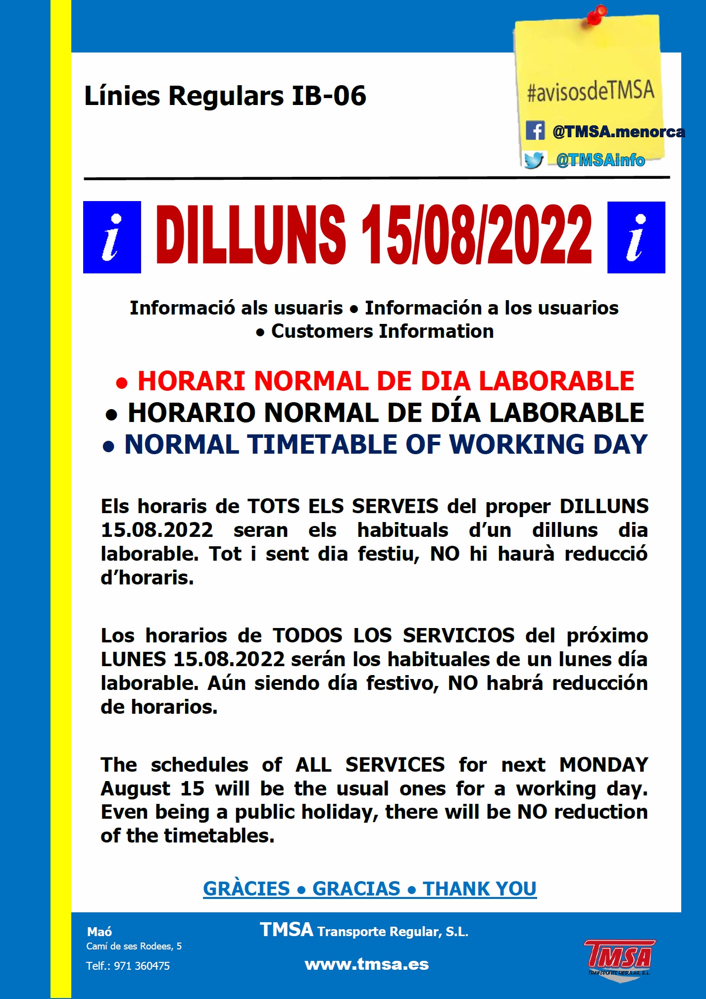 El próximo martes 23 de agosto con motivo de la celebración de las Fiestas de Sant Bartomeu, además de los horarios habituales, se llevarán también a cabo los siguientes HORARIOS ESPECIALES, mediante SERVICIOS DE REFUERZO de la línea regular L01 Maó <---> Ciutadella en los trayectos Maó ---> Ferreries y Ciutadella ---> Ferreries.
