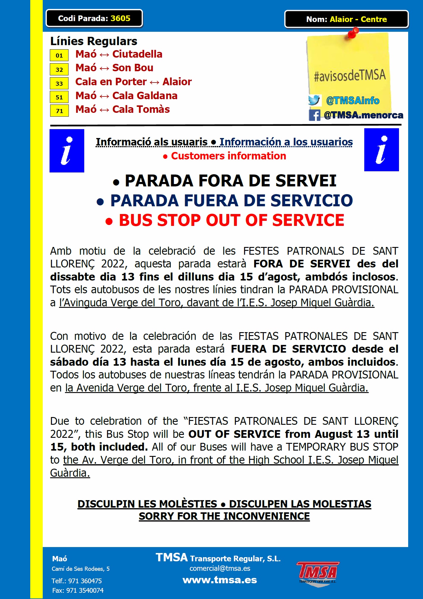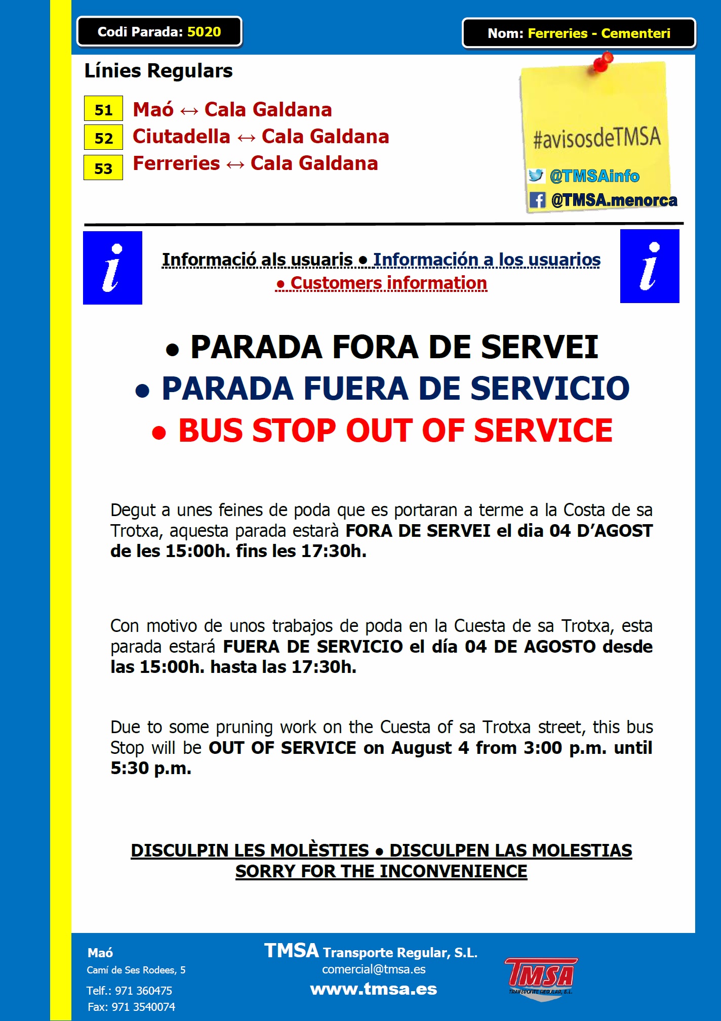 Con motivo de unos trabajos de poda en la Cuesta de sa Trotxa, la parada Ferreries - Cementeri estará FUERA DE SERVICIO el día 04 DE AGOSTO desde las 15:00h. hasta las 17:30h.