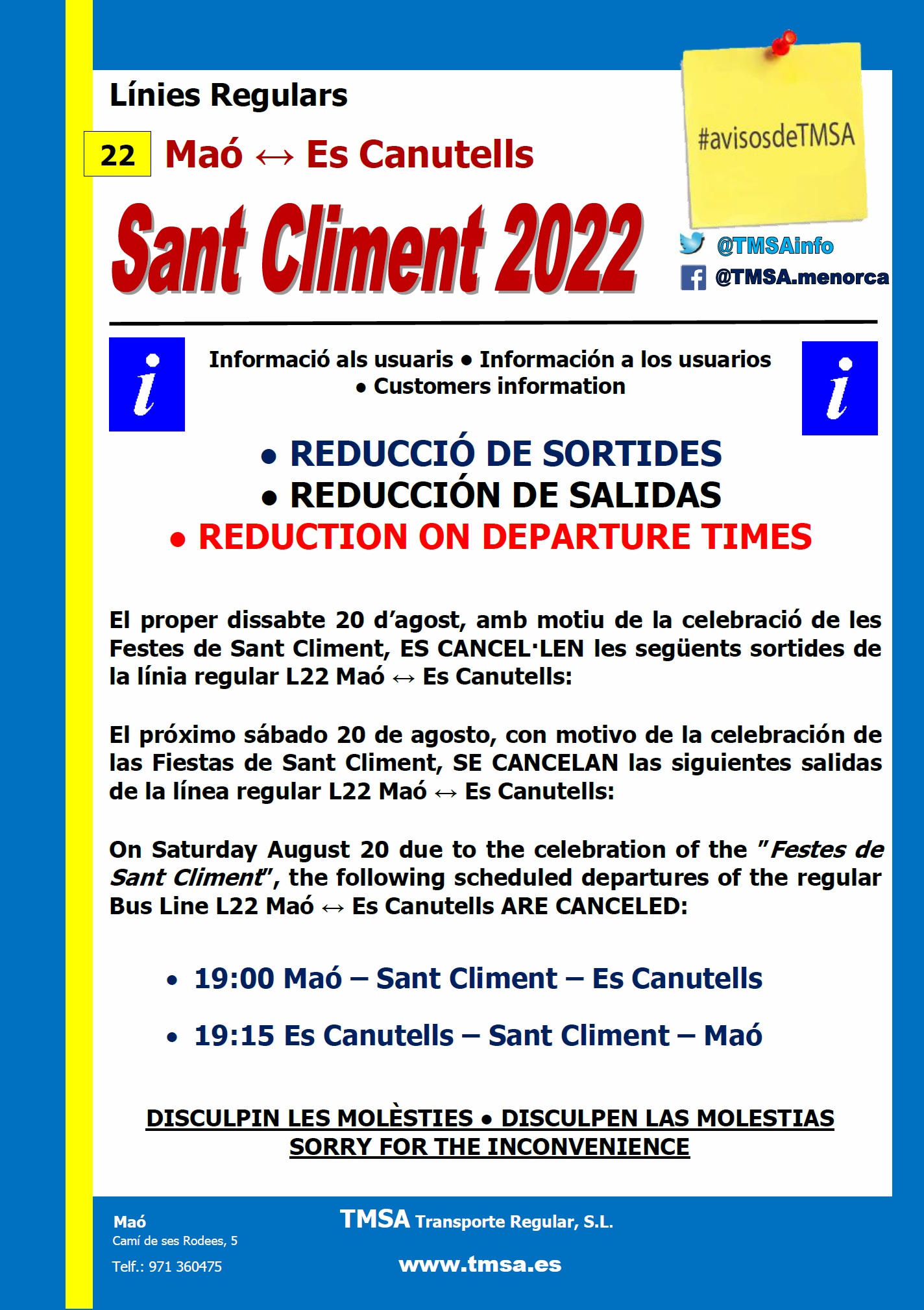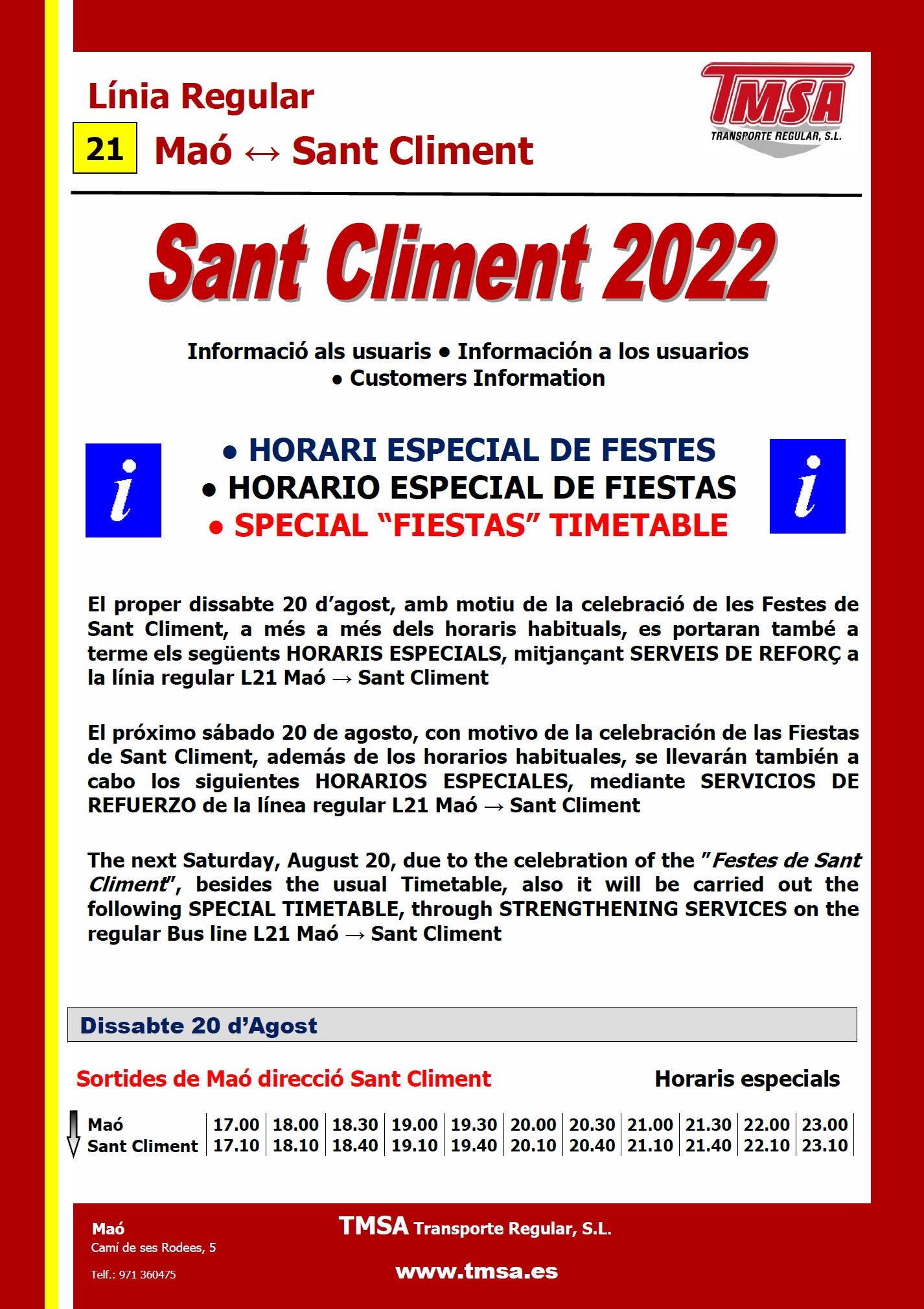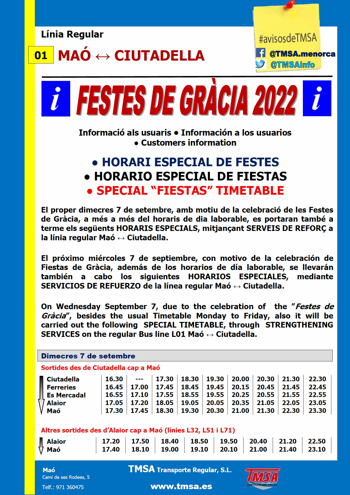 El próximo miércoles 7 de septiembre, con motivo de la celebración de Fiestas de Gràcia, además de los horarios de día laborable, se llevarán también a cabo los siguientes HORARIOS ESPECIALES, mediante SERVICIOS DE REFUERZO de la línea regular Maó <---> Ciutadella.