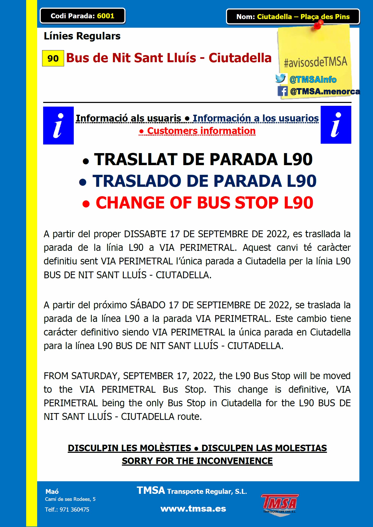 A partir del próximo SÁBADO 17 DE SEPTIEMBRE DE 2022, se traslada la parada de la línea L90 a la parada VIA PERIMETRAL. Este cambio tiene carácter definitivo siendo VIA PERIMETRAL la única parada en Ciutadella para la línea L90 BUS DE NIT SANT LLUÍS - CIUTADELLA.