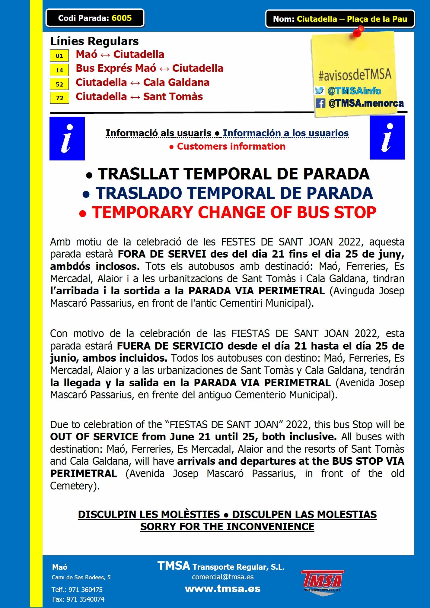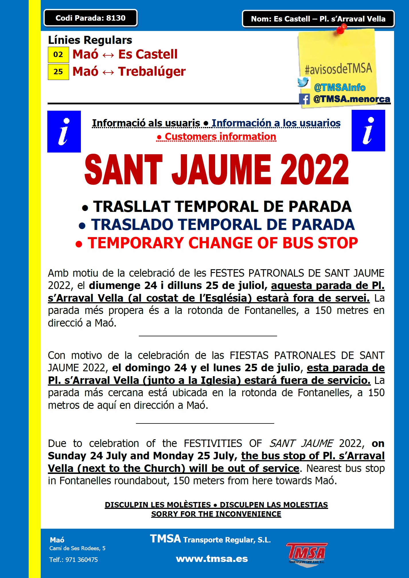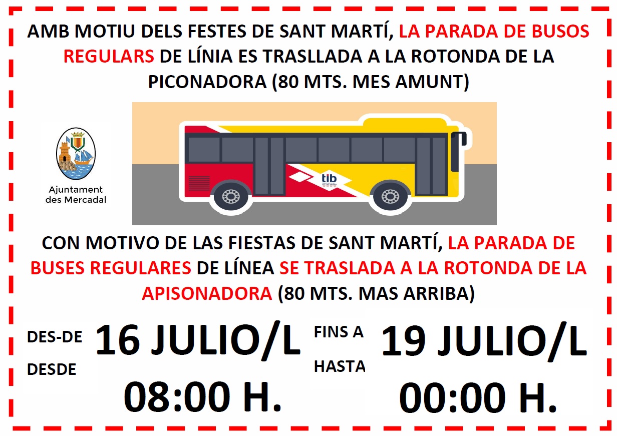Con motivo de la celebración de las FIESTAS PATRONALES DE SANT MARTÍ 2022, desde el sábado 16 de julio a las 08:00h. hasta el martes 19 de julio a las 00:00h., se ubicará la parada provisional junto a la Rotonda de la Apisonadora.
