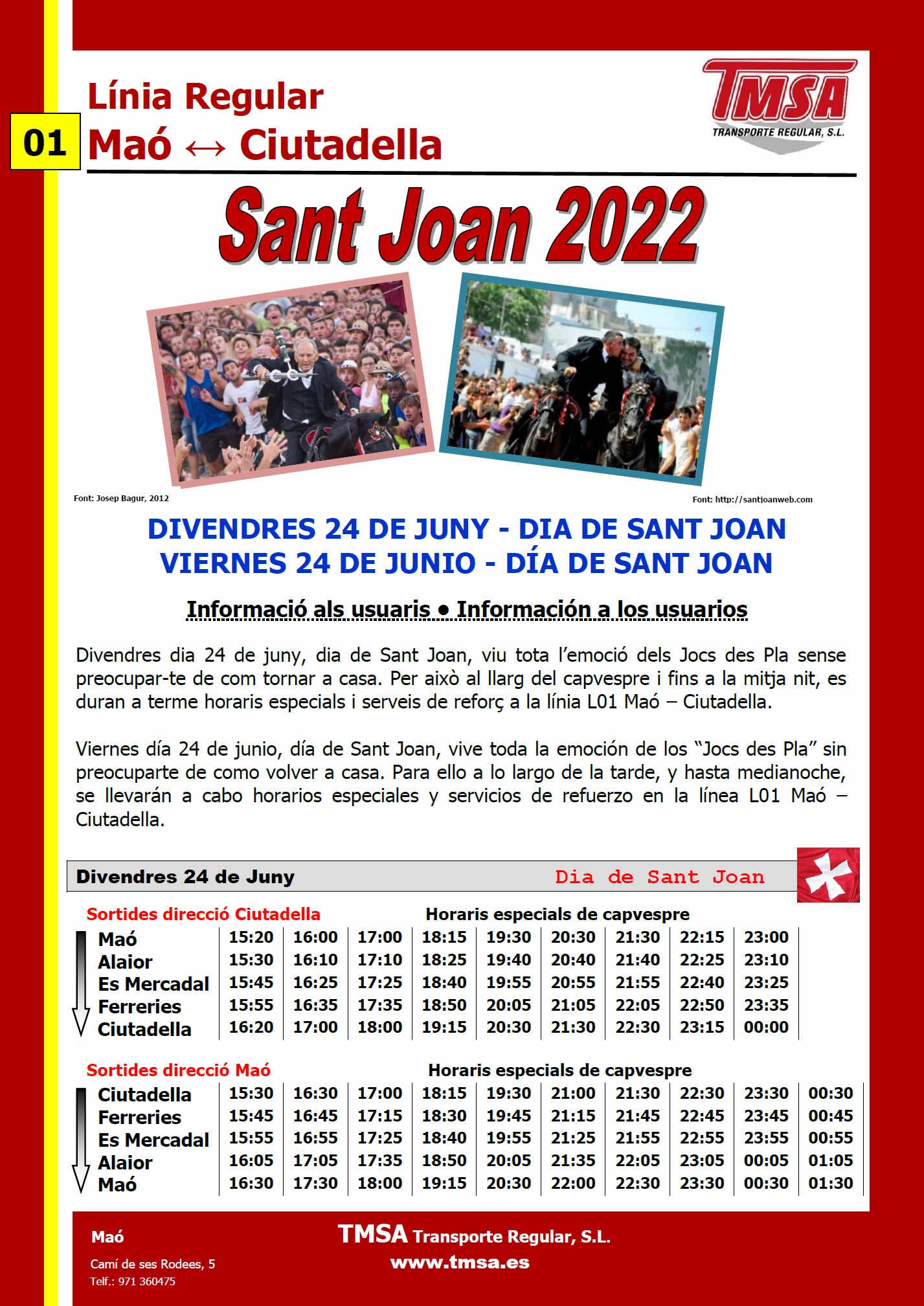 El viernes 24 de junio, día de Sant Joan, vive toda la emoción de los “Jocs des Pla” sin preocuparte de como volver a casa. Para ello, a lo largo de la tarde y hasta medianoche, se llevarán a cabo horarios especiales y servicios de refuerzo en la línea L01 Maó – Ciutadella.