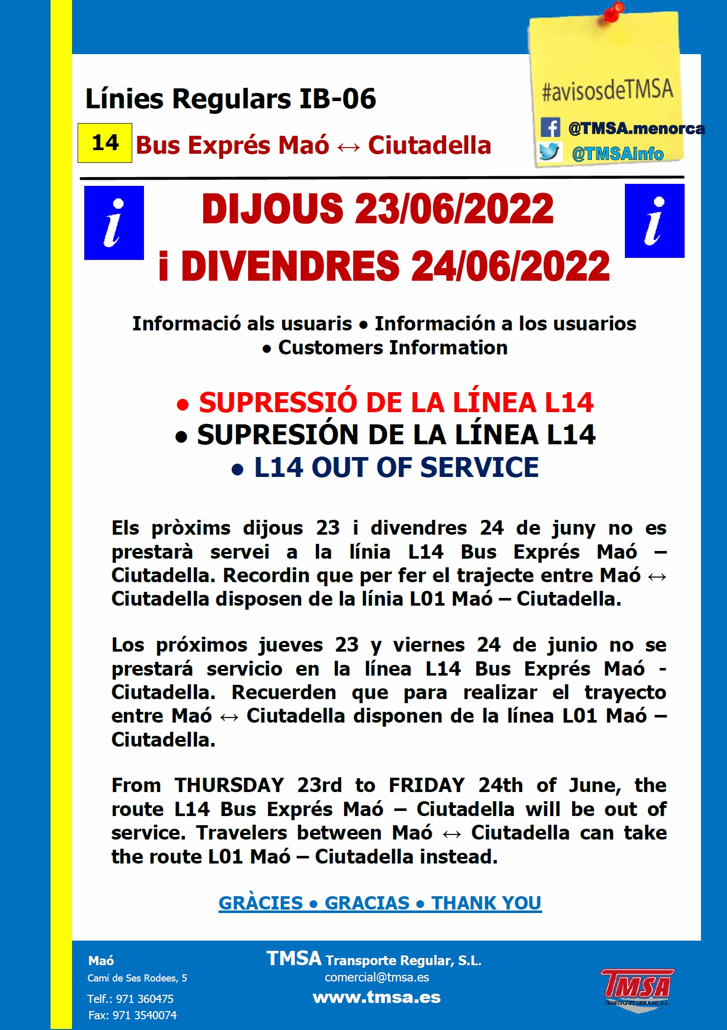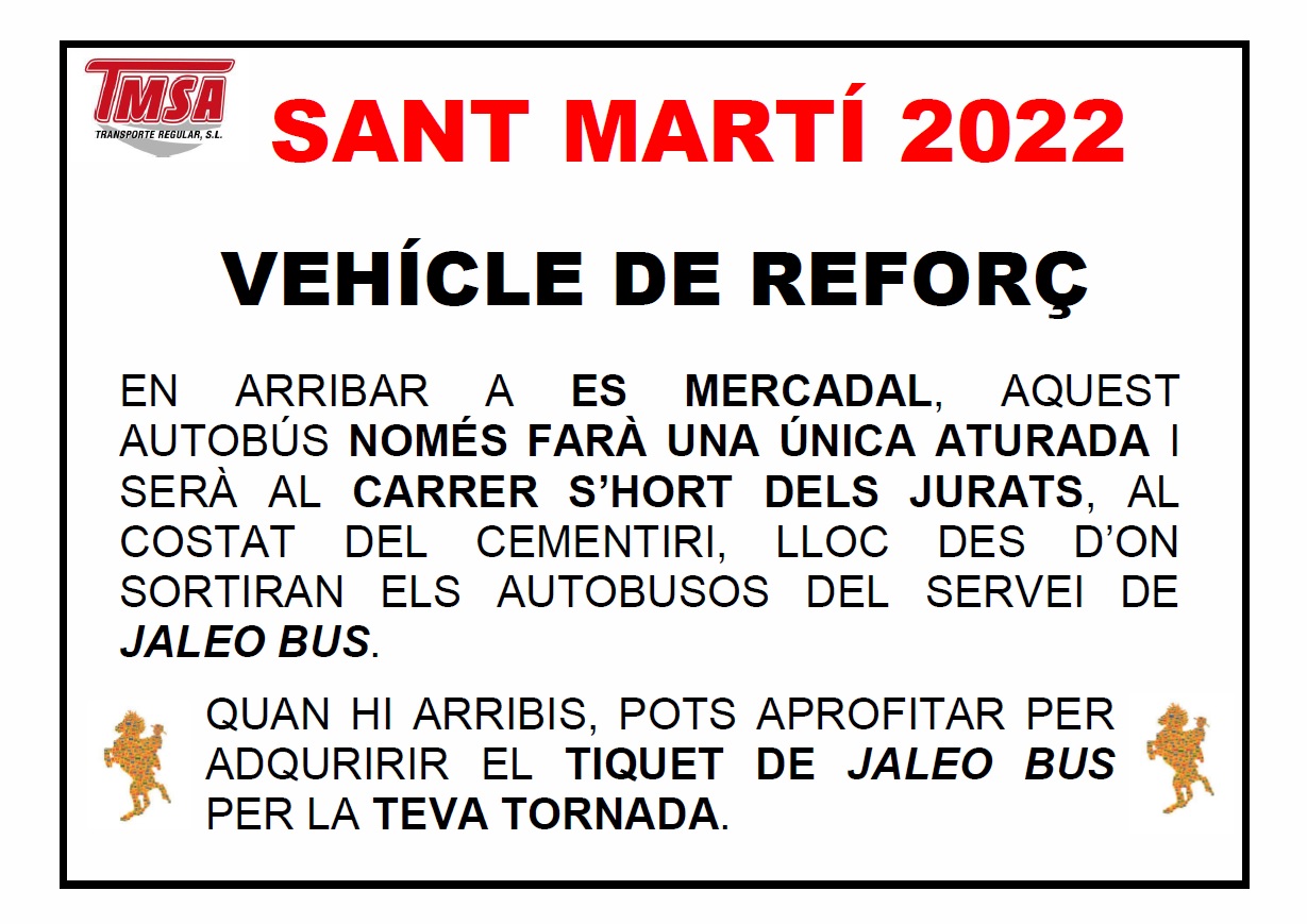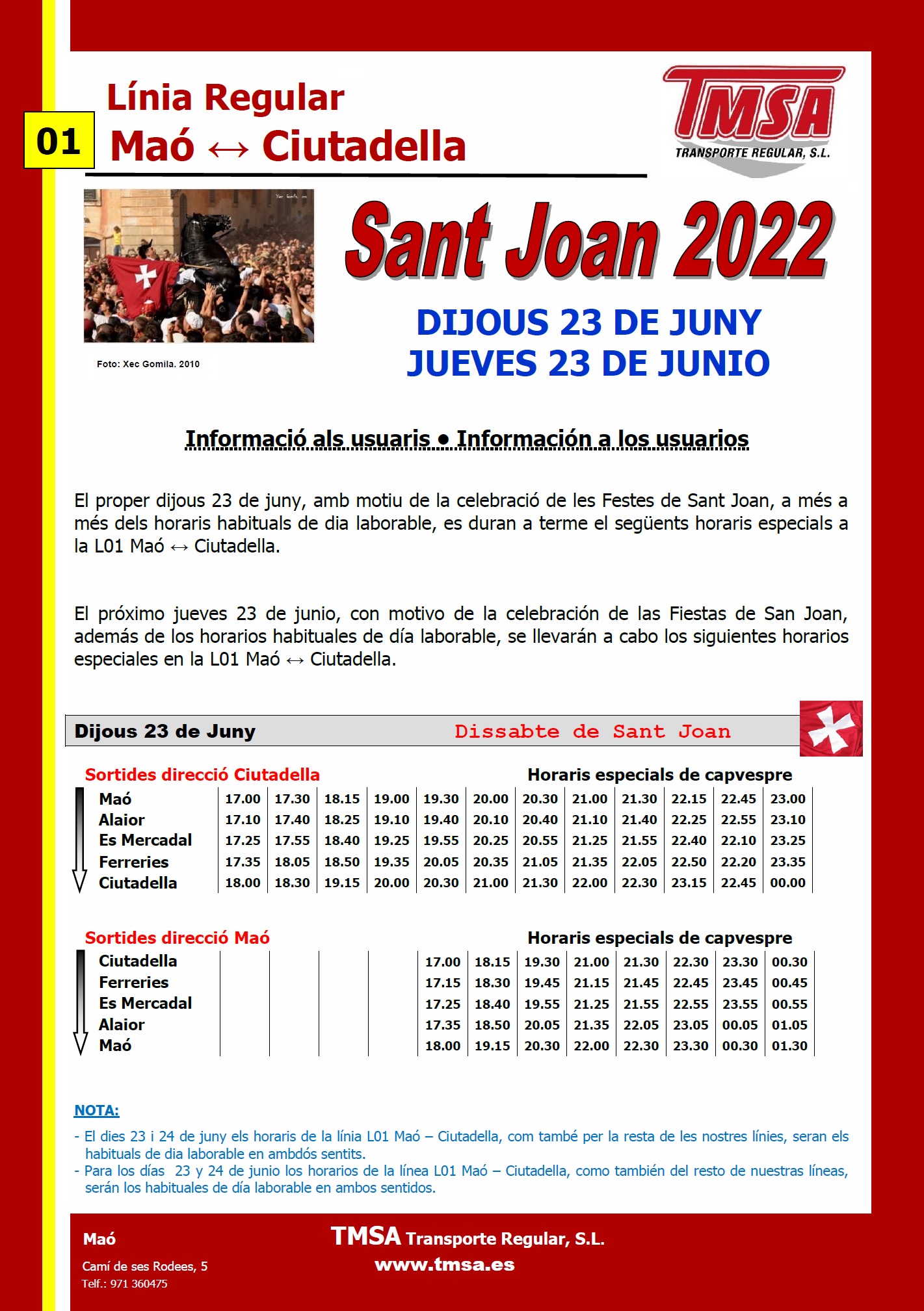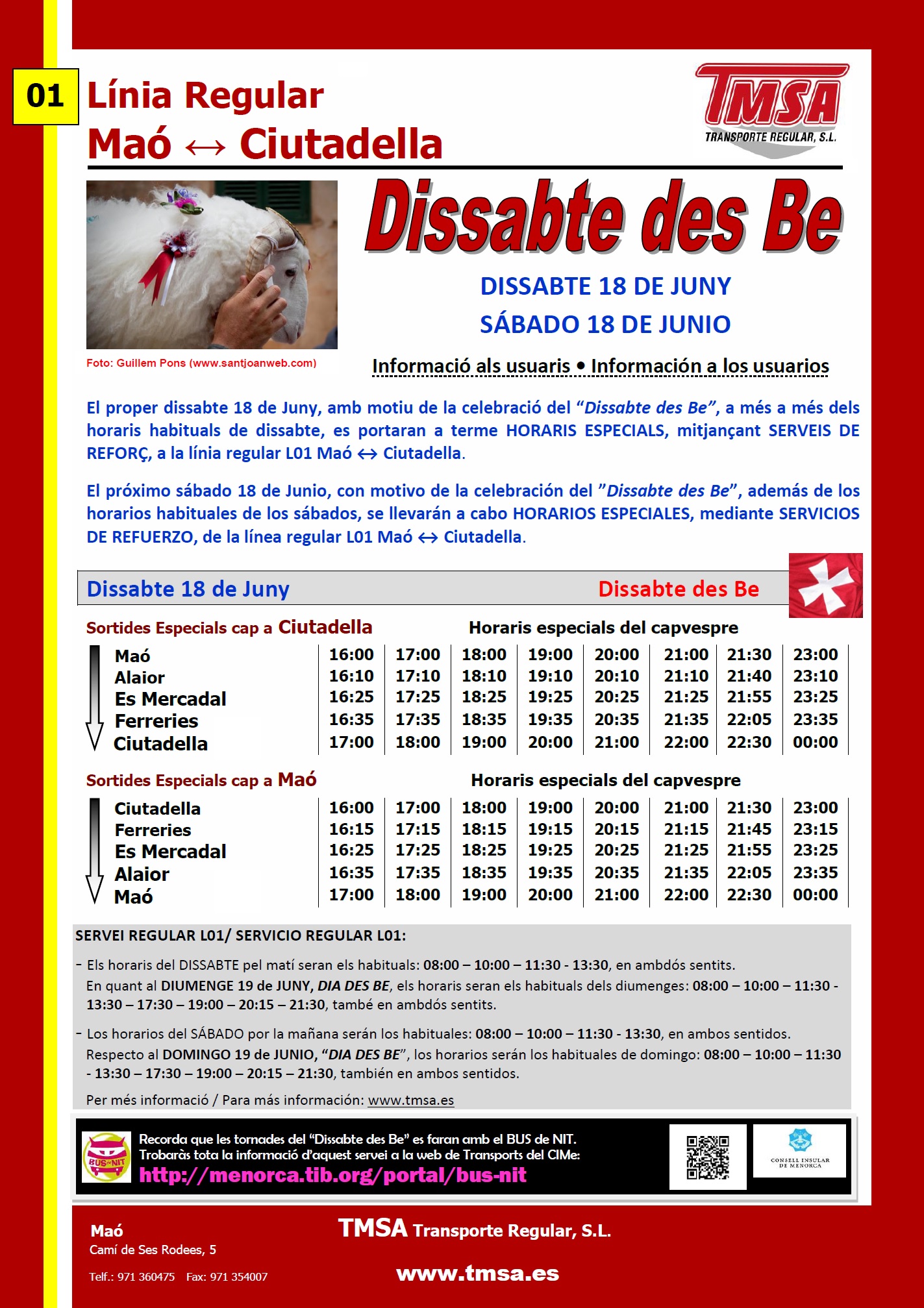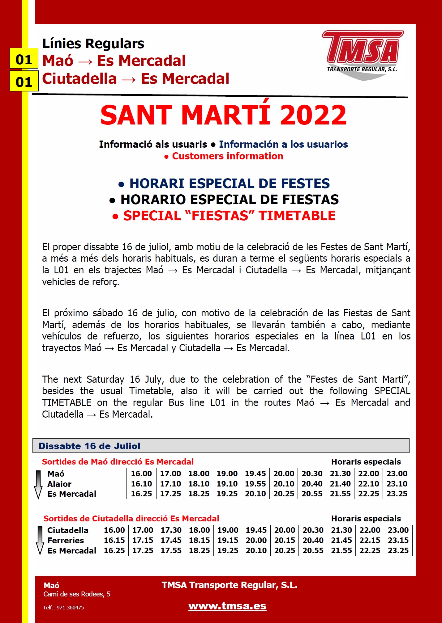 El próximo sábado 16 de julio, con motivo de la celebración de las Fiestas de Sant Martí, además de los horarios habituales, se llevarán también a cabo, mediante vehículos de refuerzo, los siguientes horarios especiales en la línea L01 en los trayectos Maó --> Es Mercadal y Ciutadella --> Es Mercadal.