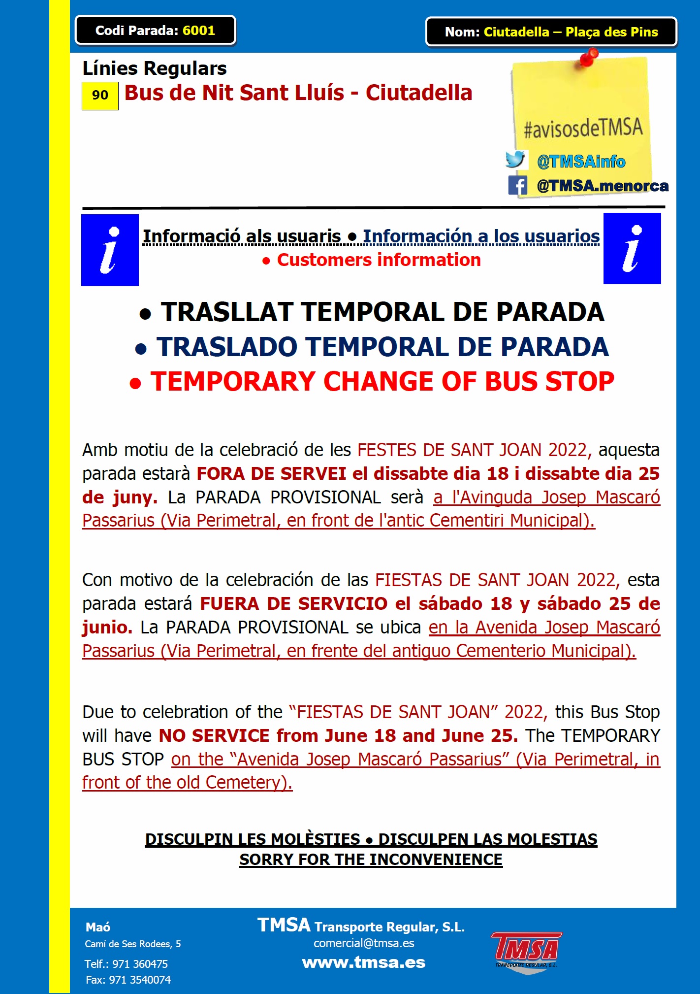 Con motivo de la celebración de las FIESTAS DE SANT JOAN 2022, la parada Plaça des Pins estará FUERA DE SERVICIO el sábado 18 y sábado 25 de junio.