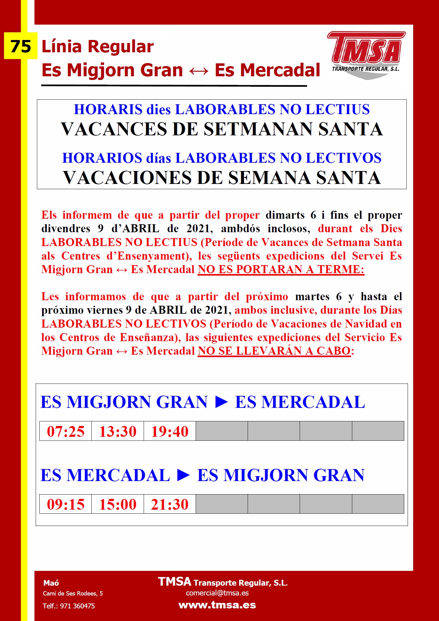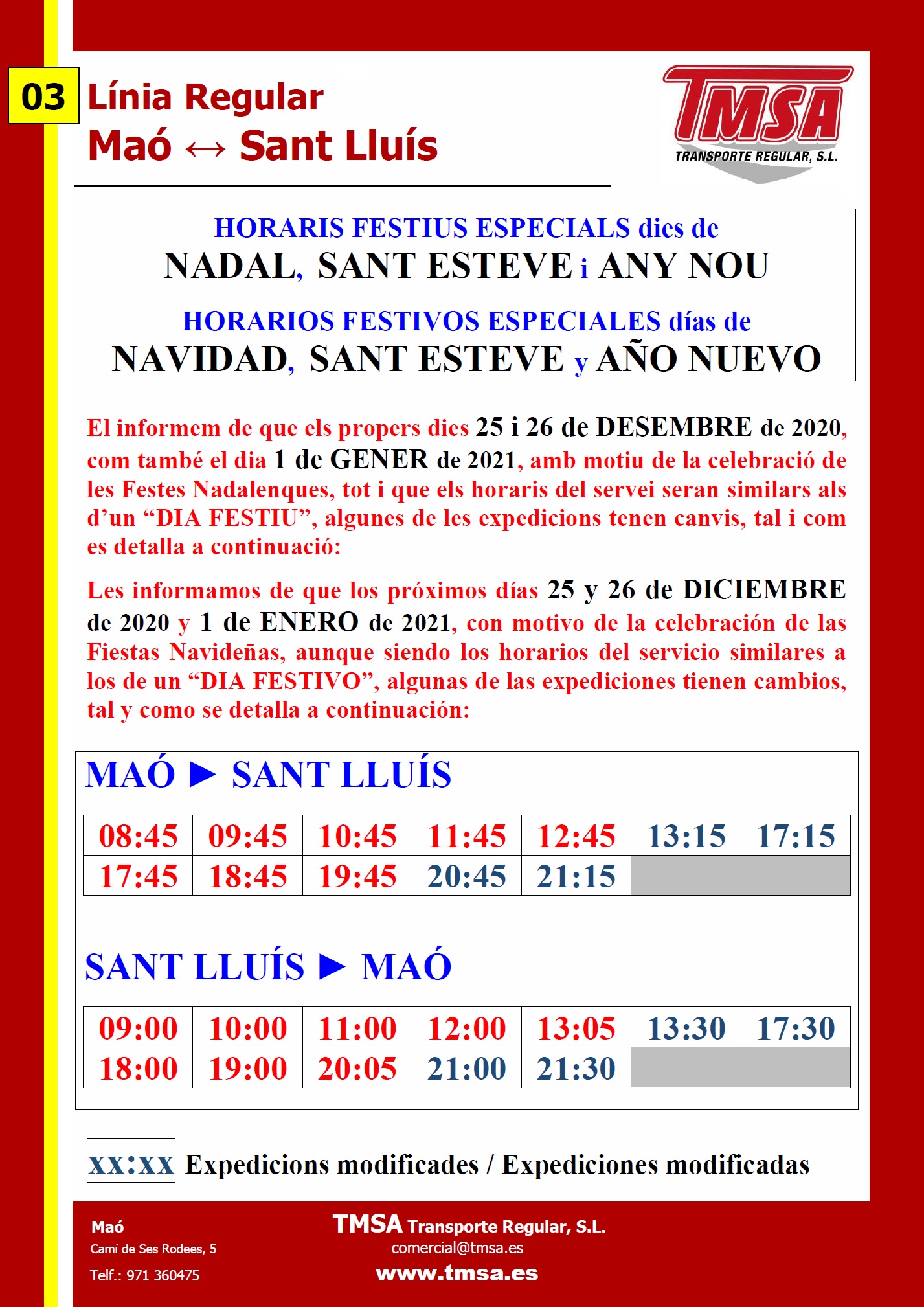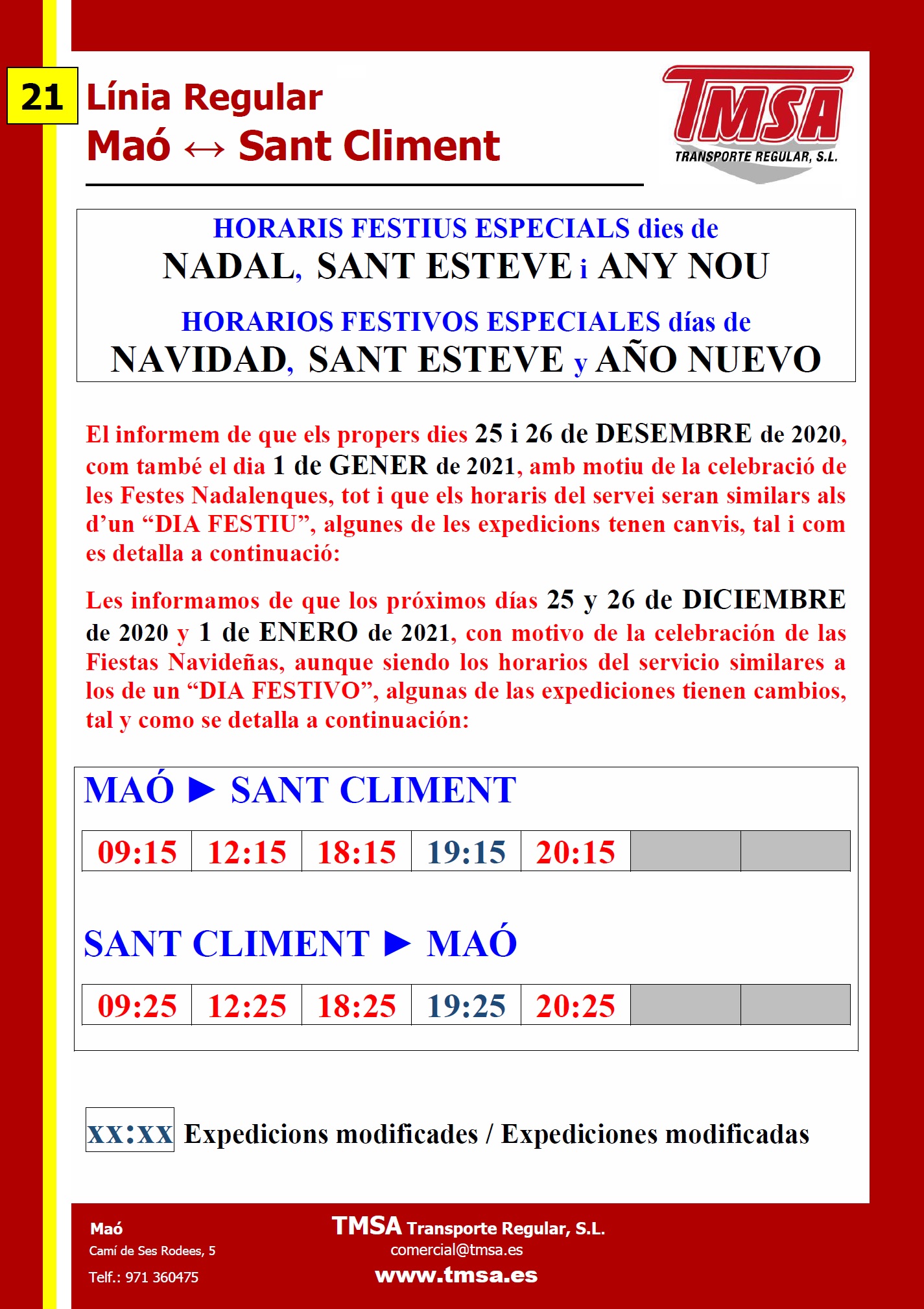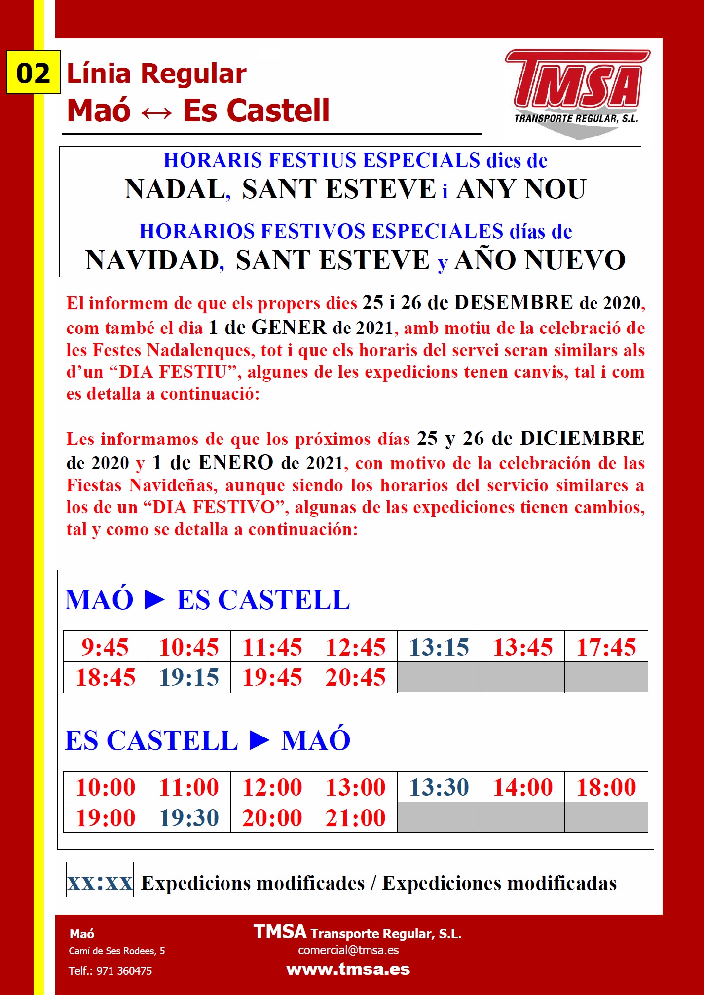 Les informamos de que los próximos días 25 de diciembre, DÍA DE NAVIDAD, y 26 de diciembre, DÍA DE SAN ESTEBAN, como también el día 1 de enero de 2021, DÍA DE AÑO NUEVO, con motivo de la celebración de las Fiestas Navideñas, aun siendo los horarios del servicio SIMILARES a los de un “DÍA FESTIVO”, algunas de las expediciones verán modificado su horario.