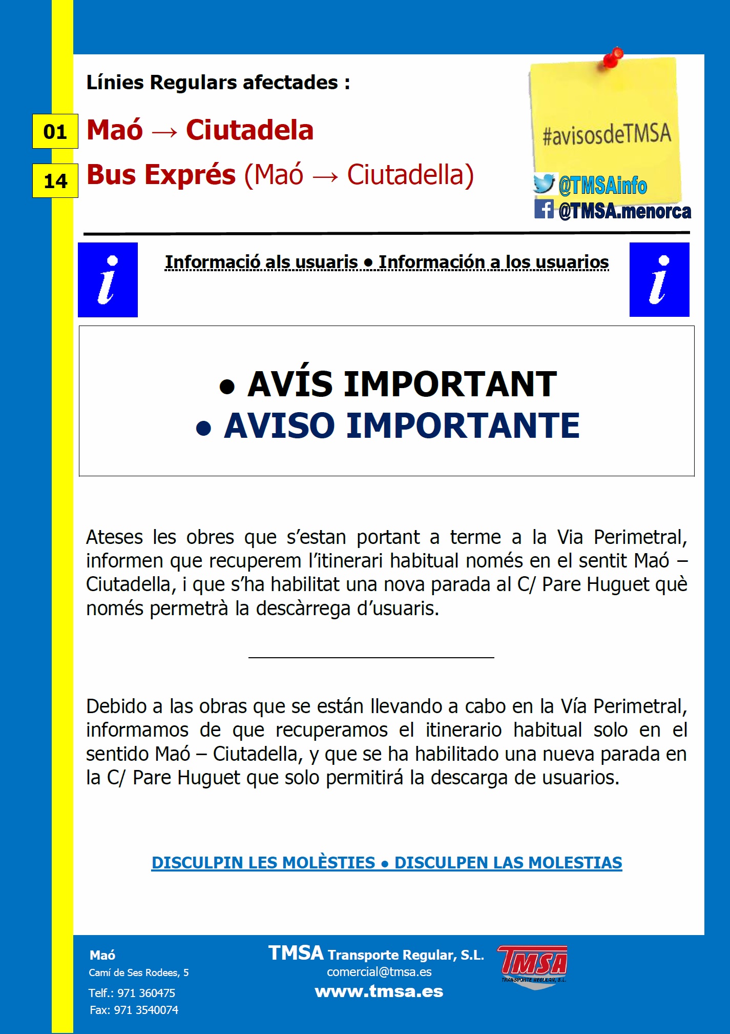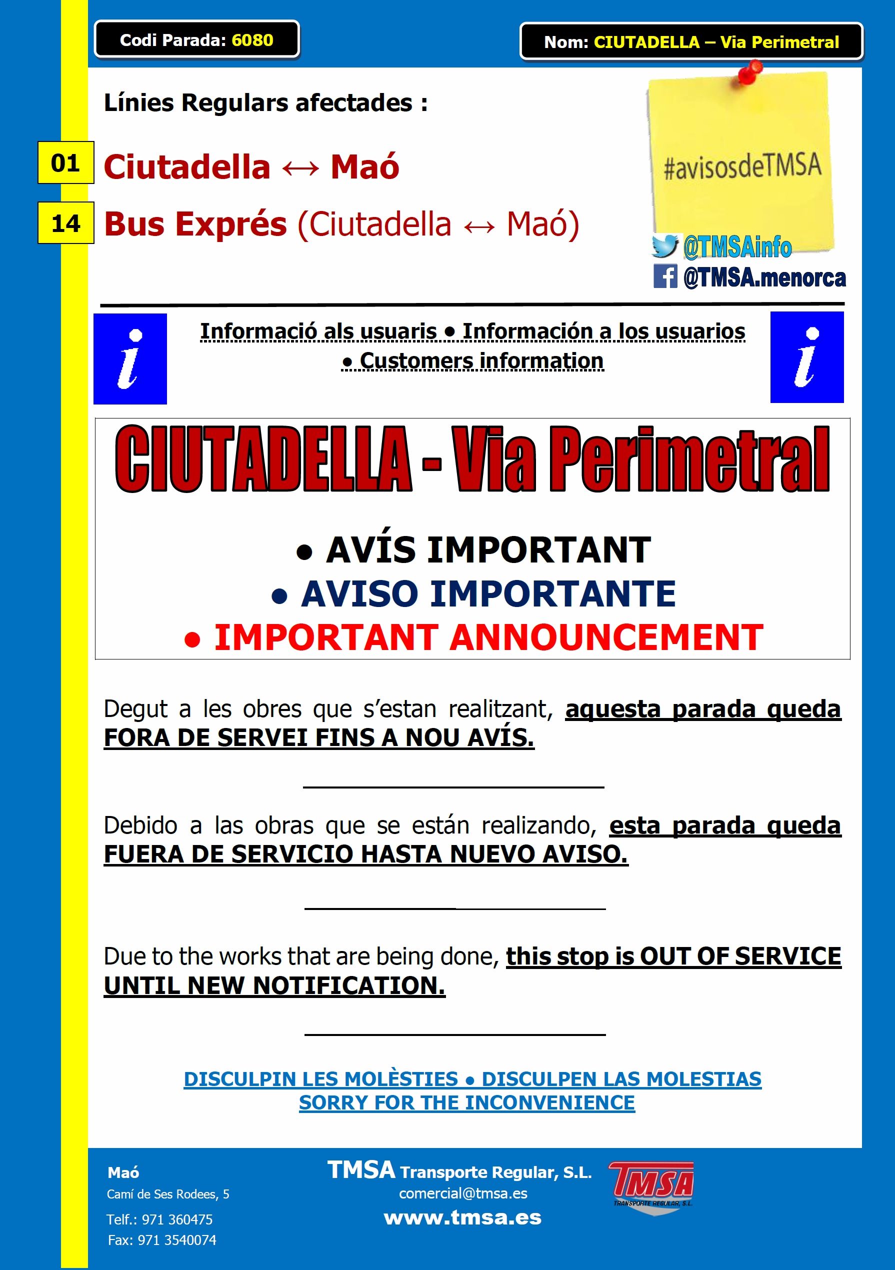Debido a las obras que se están realizando, la parada Ciutadella - Vía Perimetral queda FUERA DE SERVICIO HASTA NUEVO AVISO.