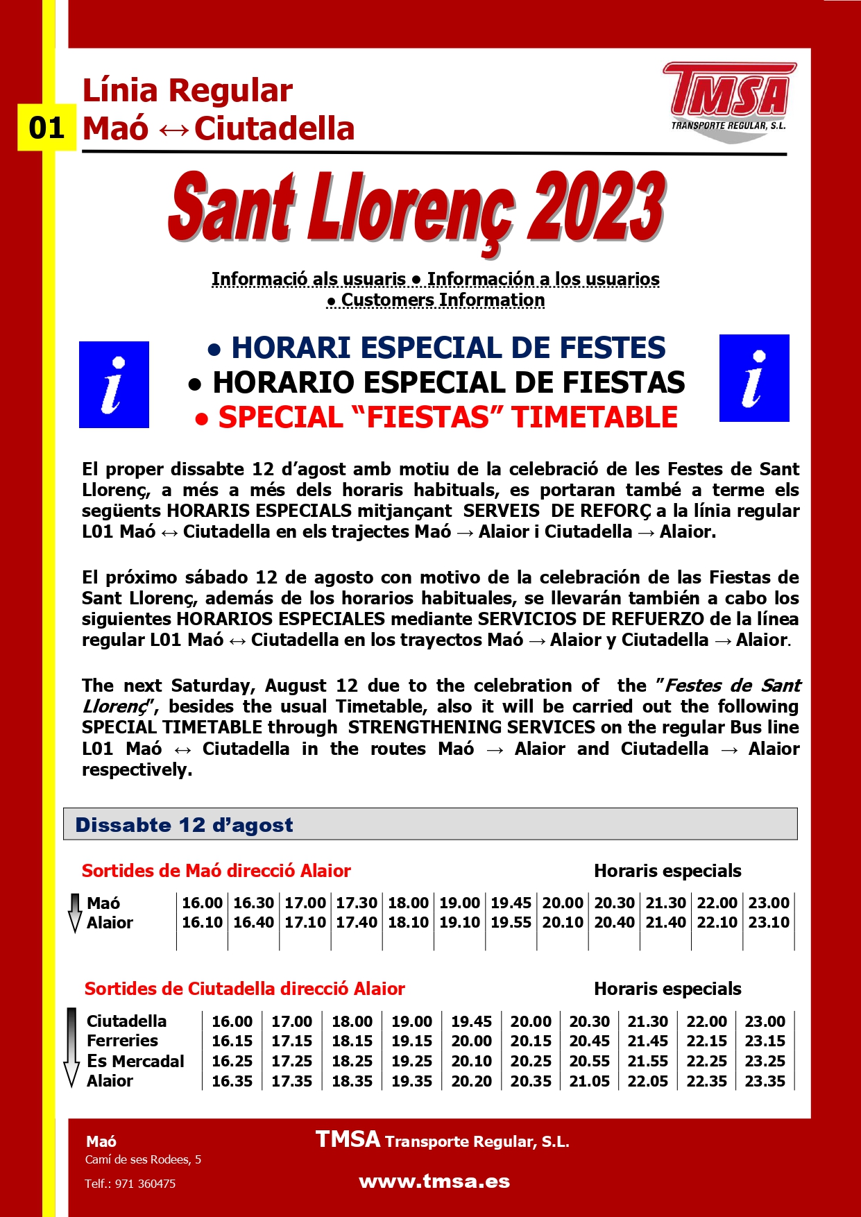 El próximo sábado 12 de agosto con motivo de la celebración de las Fiestas de Sant Llorenç, además de los horarios habituales, se llevarán también a cabo los siguientes HORARIOS ESPECIALES mediante SERVICIOS DE REFUERZO de la línea regular L01 Maó Ciutadella en los trayectos Maó Alaior y Ciutadella Alaior.