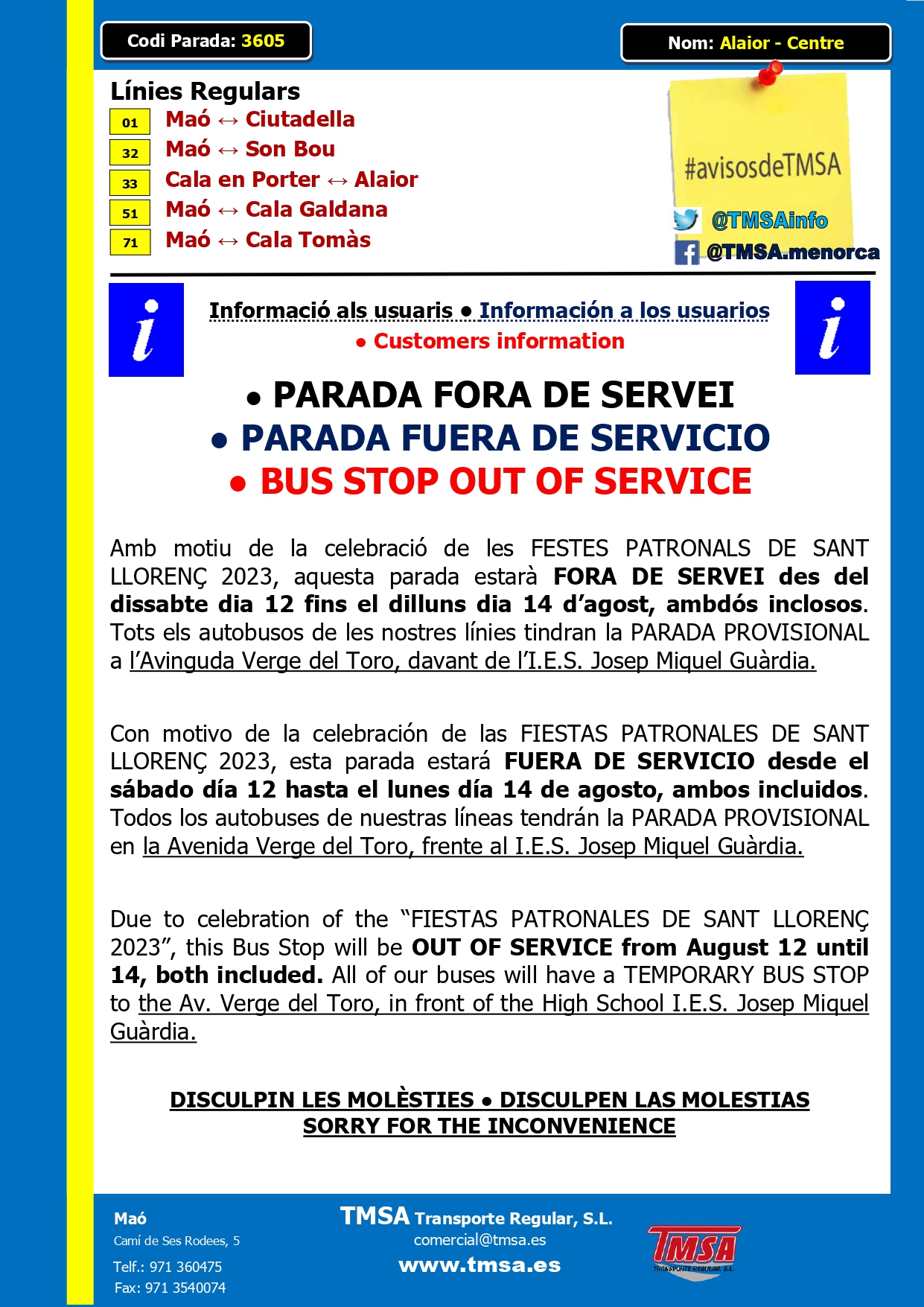 Con motivo de la celebración de las FIESTAS PATRONALES DE SANT LLORENÇ 2023, la parada ALAIOR - CENTRE estará FUERA DE SERVICIO desde el sábado día 12 hasta el lunes día 14 de agosto, ambos incluidos. Todos los autobuses de nuestras líneas tendrán la PARADA PROVISIONAL en la Avenida Verge del Toro, frente al I.E.S. Josep Miquel Guàrdia.