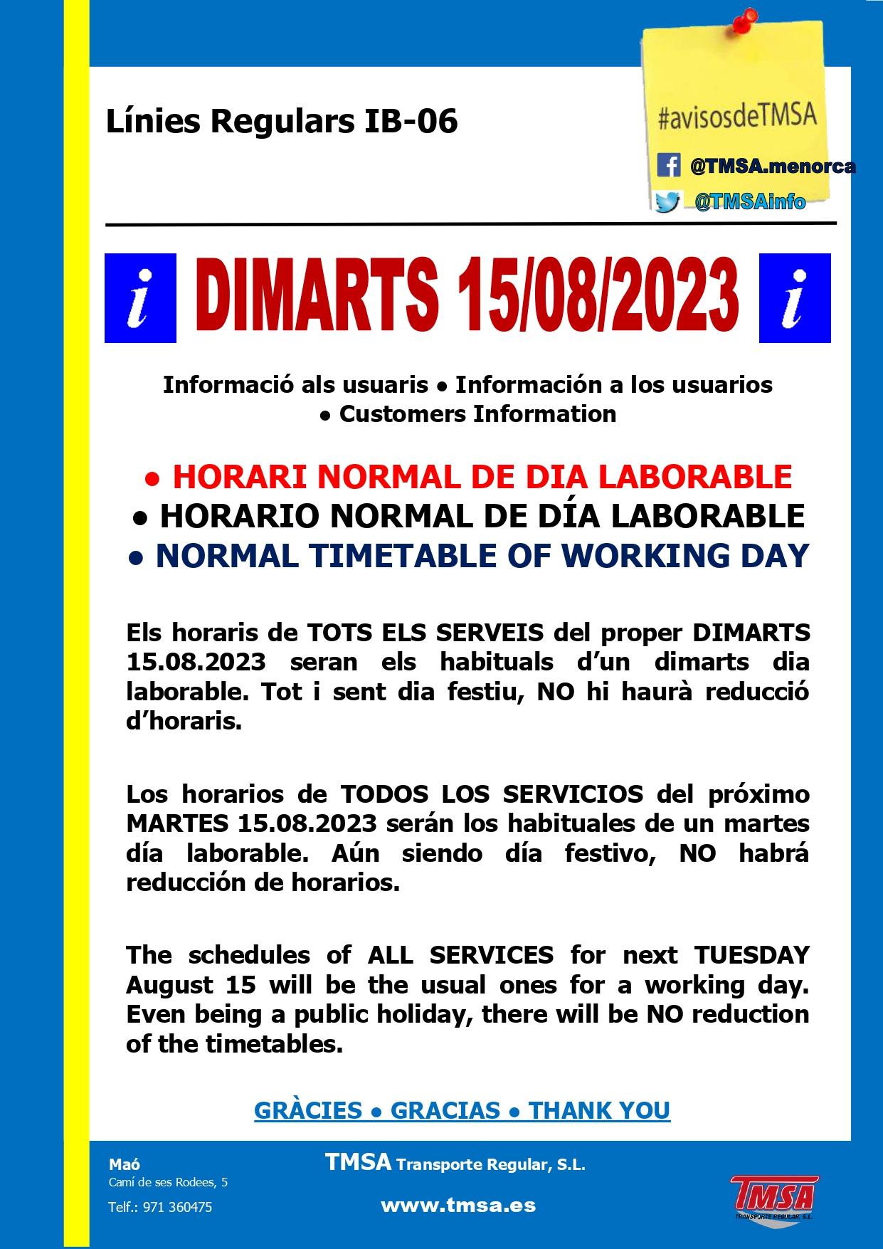 Los horarios de TODOS LOS SERVICIOS del próximo MARTES 15.08.2023 serán los habituales de un martes día laborable. Aún siendo día festivo, NO habrá reducción de horarios.