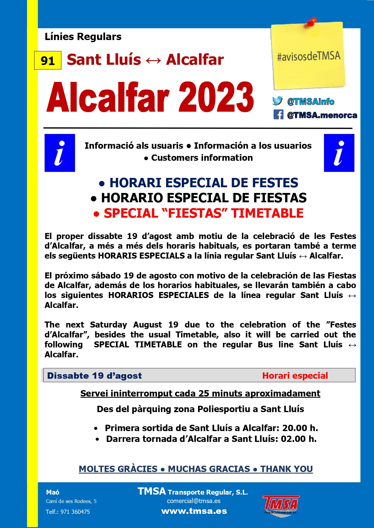 El próximo sábado 19 de agosto con motivo de la celebración de las Fiestas de Alcalfar, además de los horarios habituales, se llevarán también a cabo los siguientes HORARIOS ESPECIALES de la línea regular Sant Lluís <---> Alcalfar
