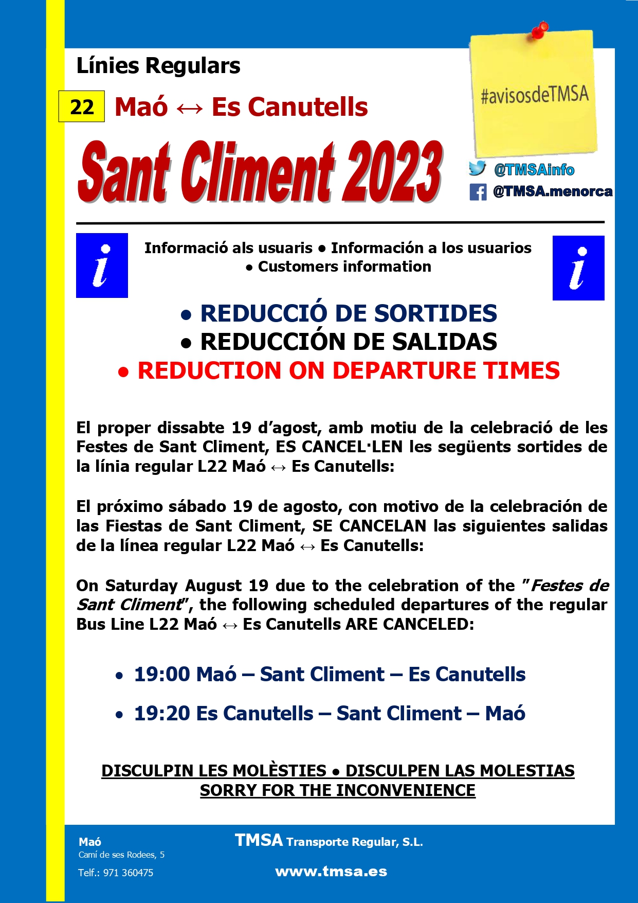 El póximo sábado 19 de agosto con motivo de la celebración de las Fiestas de Sant Climent, SE CANCELAN las siguientes salidas de la línea regular L22 Maó - Es Canutells: