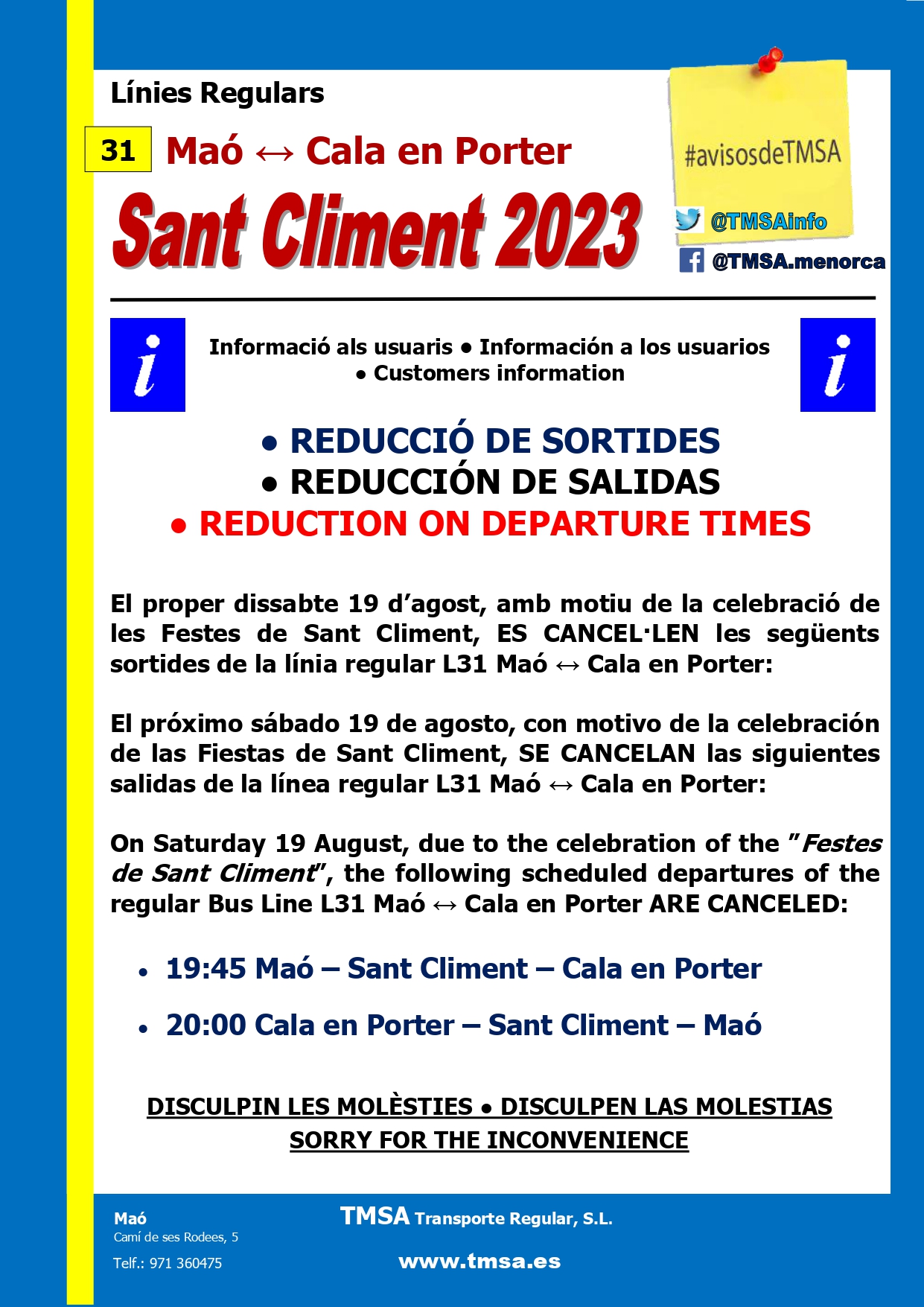 El próximo sábado 19 de agosto com motivo de la celebración de las Fiestas de Sant Climent, SE CANCELAN las siguientes salidas de la línea regular L31 Maó - Cala en Porter: