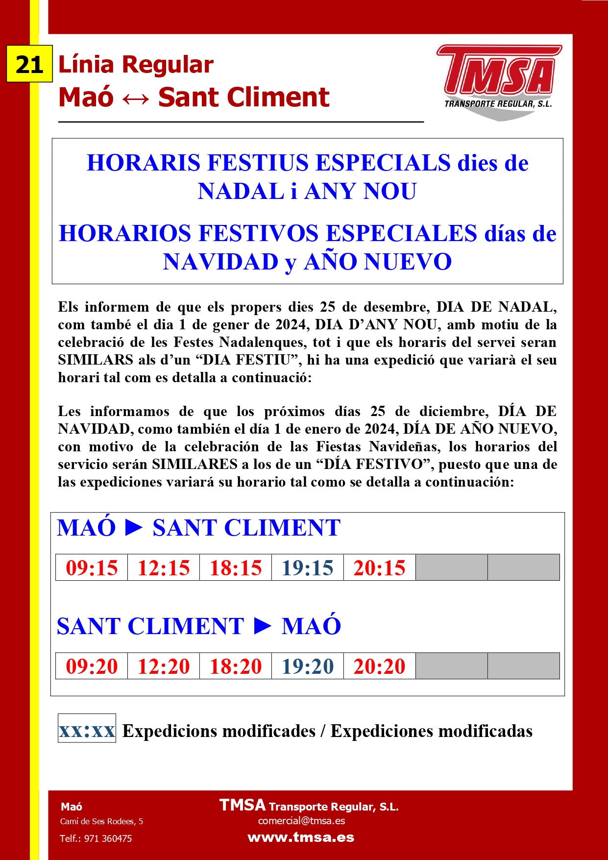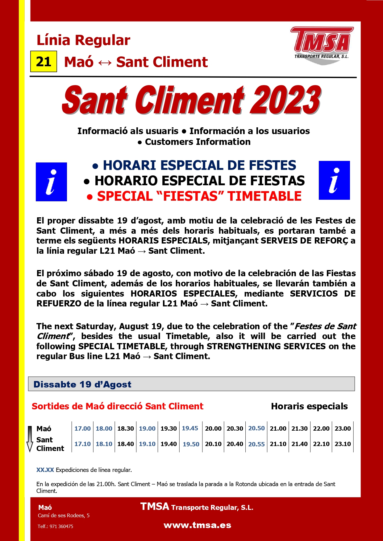 El próximo sábado 19 de agosto, con motivo de la celebración de las Fiestas de Sant Climent, además de los horarios habituales, se llevarán también a cabo los siguientes HORARIOS ESPECIALES, mediante SERVICIOS DE REFUERZO de la línea regular L21 Maó Sant Climent.