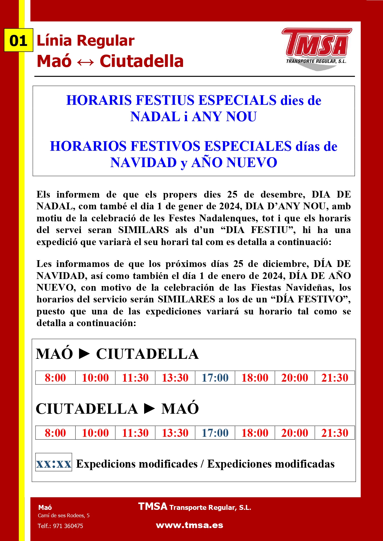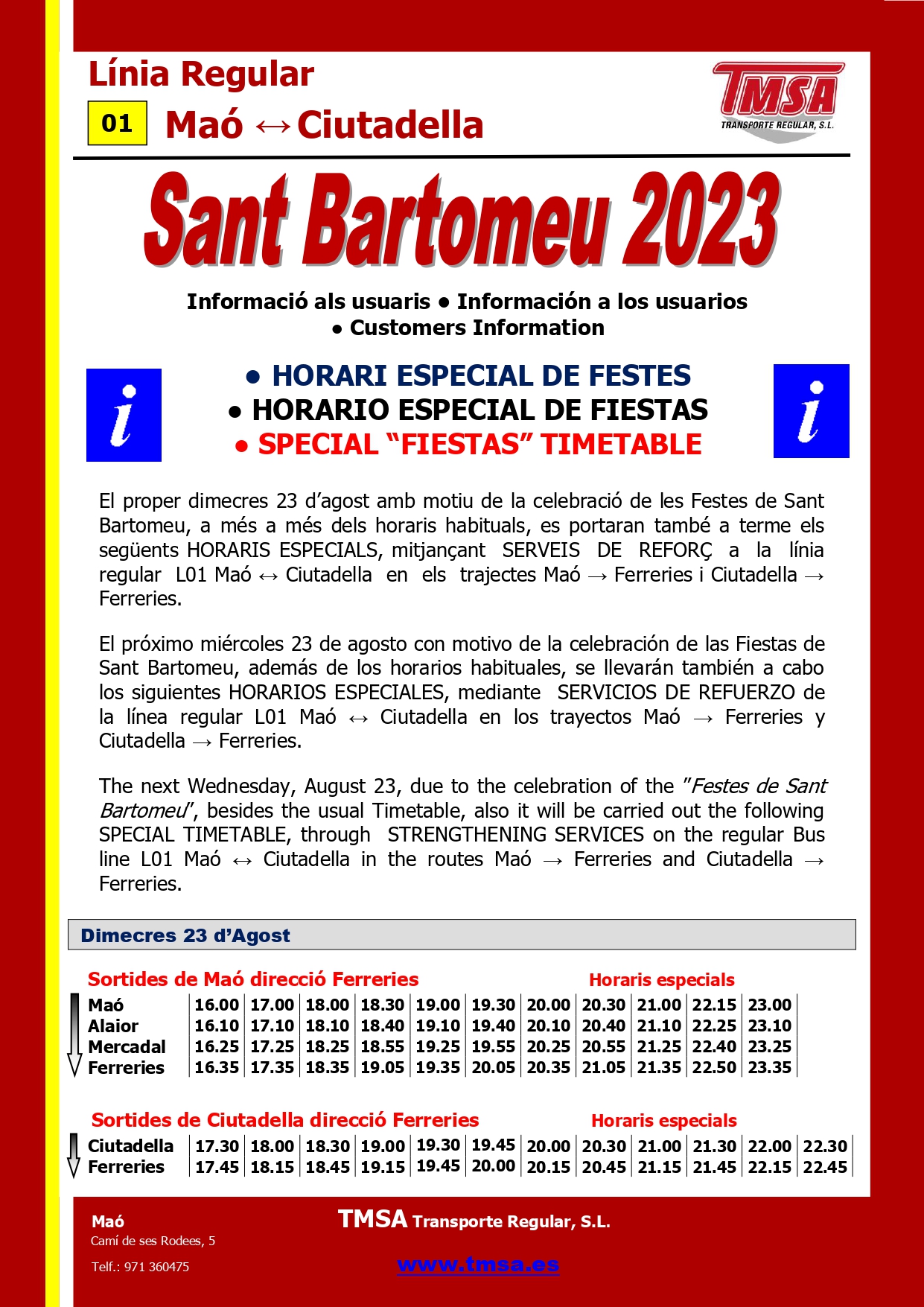 El próximo miércoles 23 de agosto con motivo de la celebración de las Fiestas de Sant Bartomeu, además de los horarios habituales, se llevarán también a cabo los siguientes HORARIOS ESPECIALES, mediante  SERVICIOS DE REFUERZO de la línea regular L01 Maó ↔ Ciutadella en los trayectos Maó Ferreries y Ciutadella → Ferreries.