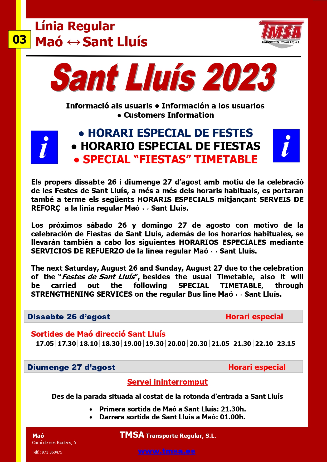 Los próximos sábado 26 y domingo 27 de agosto con motivo de la celebración de las Fiestas de Sant Lluís, además de los horarios habituales, se llevarán también a cabo los siguientes HORARIOS ESPECIALES mediante SERVICIOS DE REFUERZO de la línea regular Maó  Sant Lluís.
