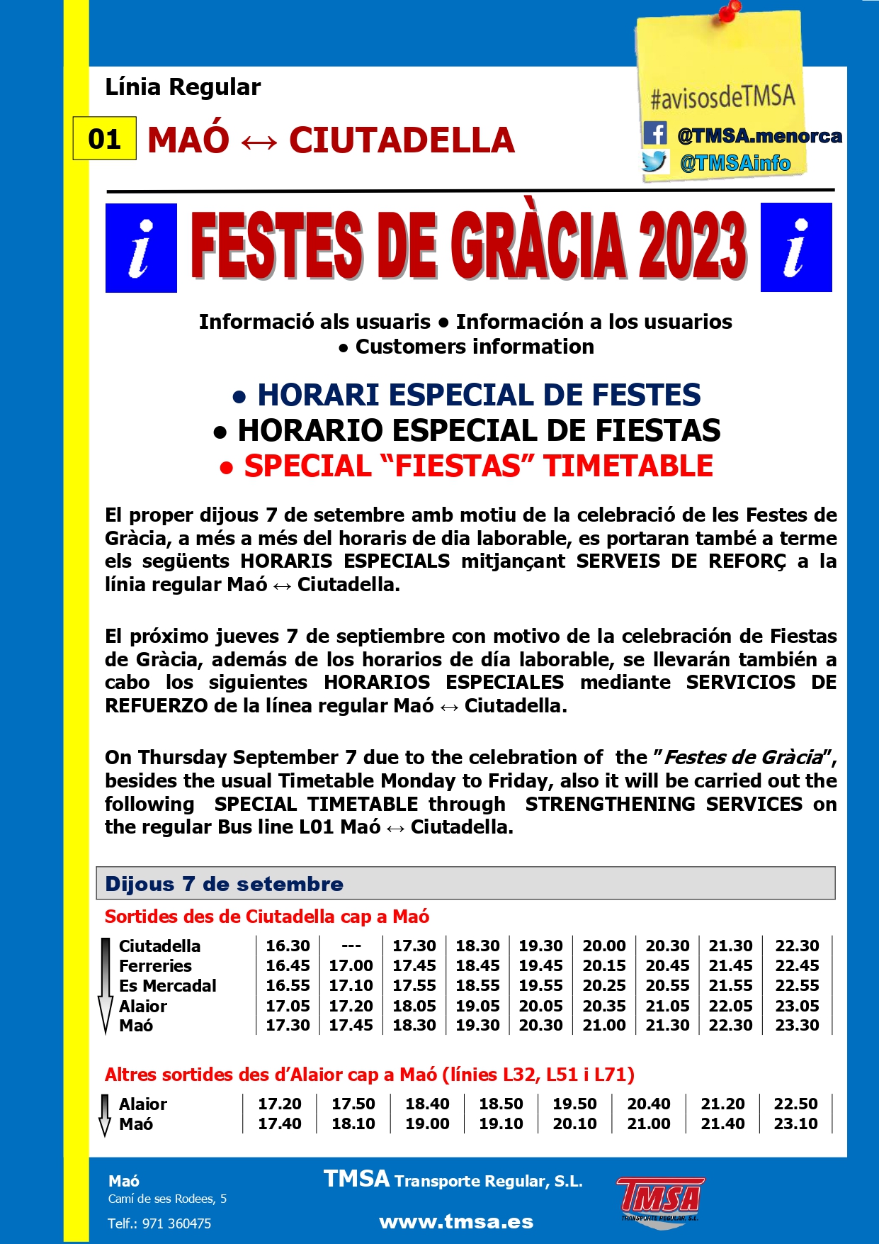 El próximo jueves 7 de septiembre con motivo de la celebración de Fiestas de Gràcia, además de los horarios de día laborable, se llevarán también a cabo los siguientes HORARIOS ESPECIALES mediante SERVICIOS DE REFUERZO de la línea regular Maó ↔ Ciutadella.