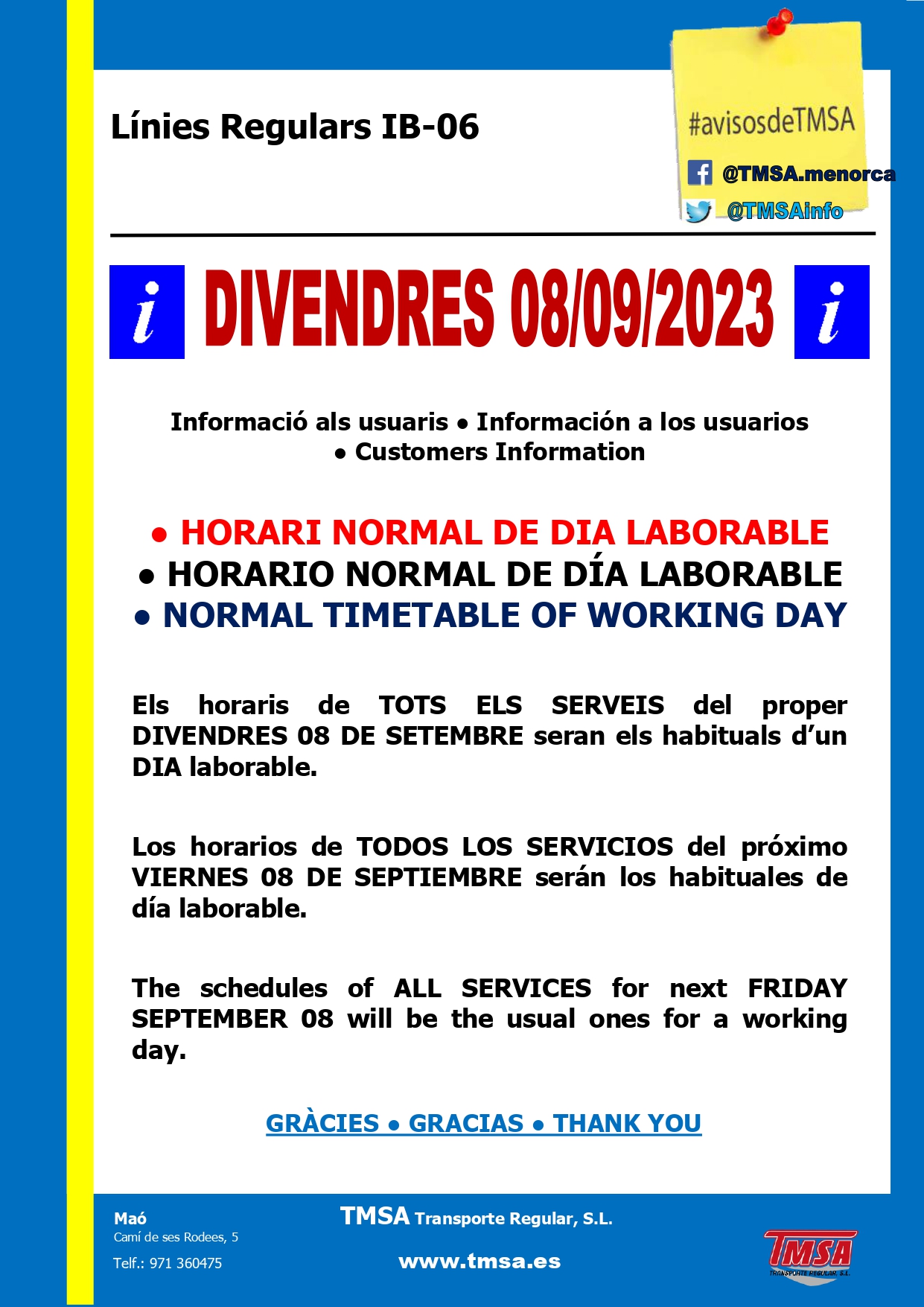 Los horarios de TODOS LOS SERVICIOS del próximo VIERNES 08 DE SEPTIEMBRE serán los habituales de día laborable.