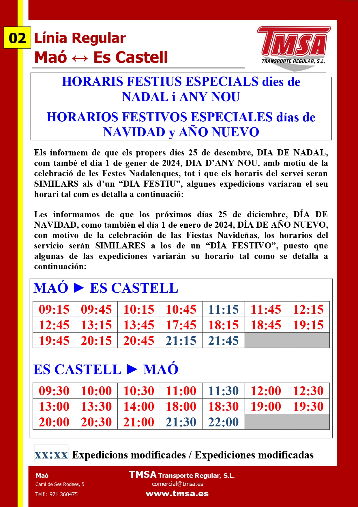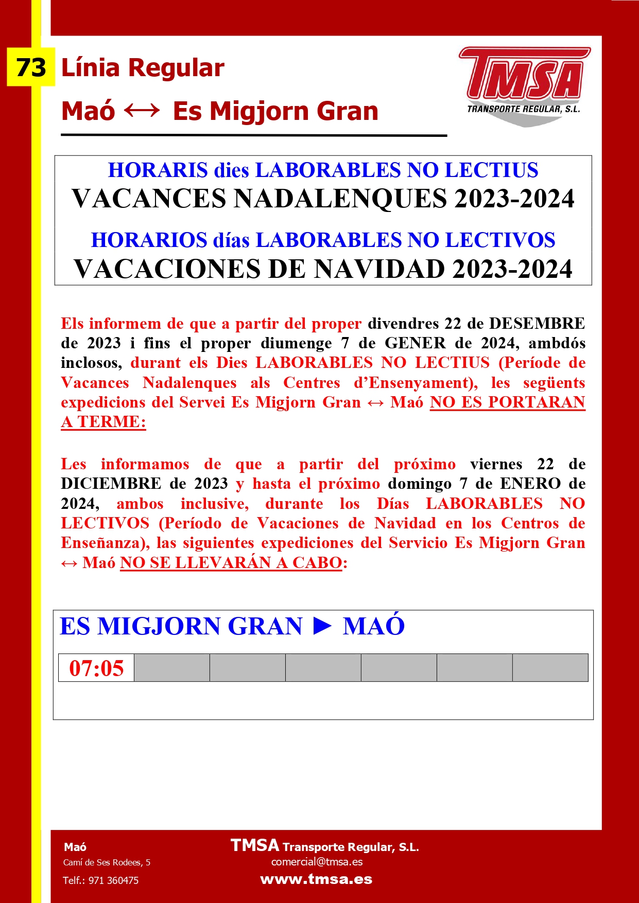 Les informamos de que a partir del próximo viernes 22 de DICIEMBRE de 2023 y hasta el próximo domingo 07 de ENERO de 2024, ambos inclusive, durante los Días LABORABLES NO LECTIVOS (período de vacaciones de navidad en los centros de enseñanza), las siguientes expediciones del Servicio Es Migjorn Gran ---> Maó NO SE LLEVARÁN A CABO: