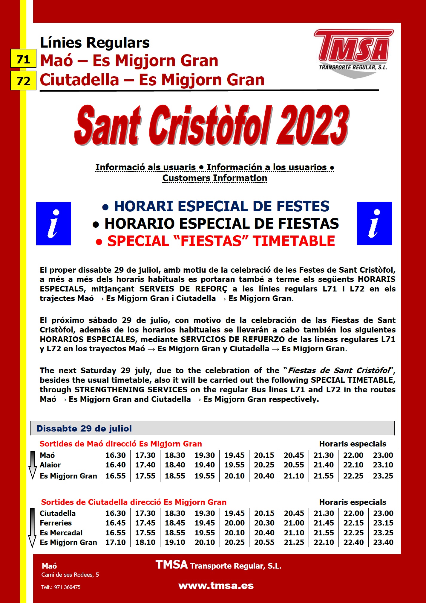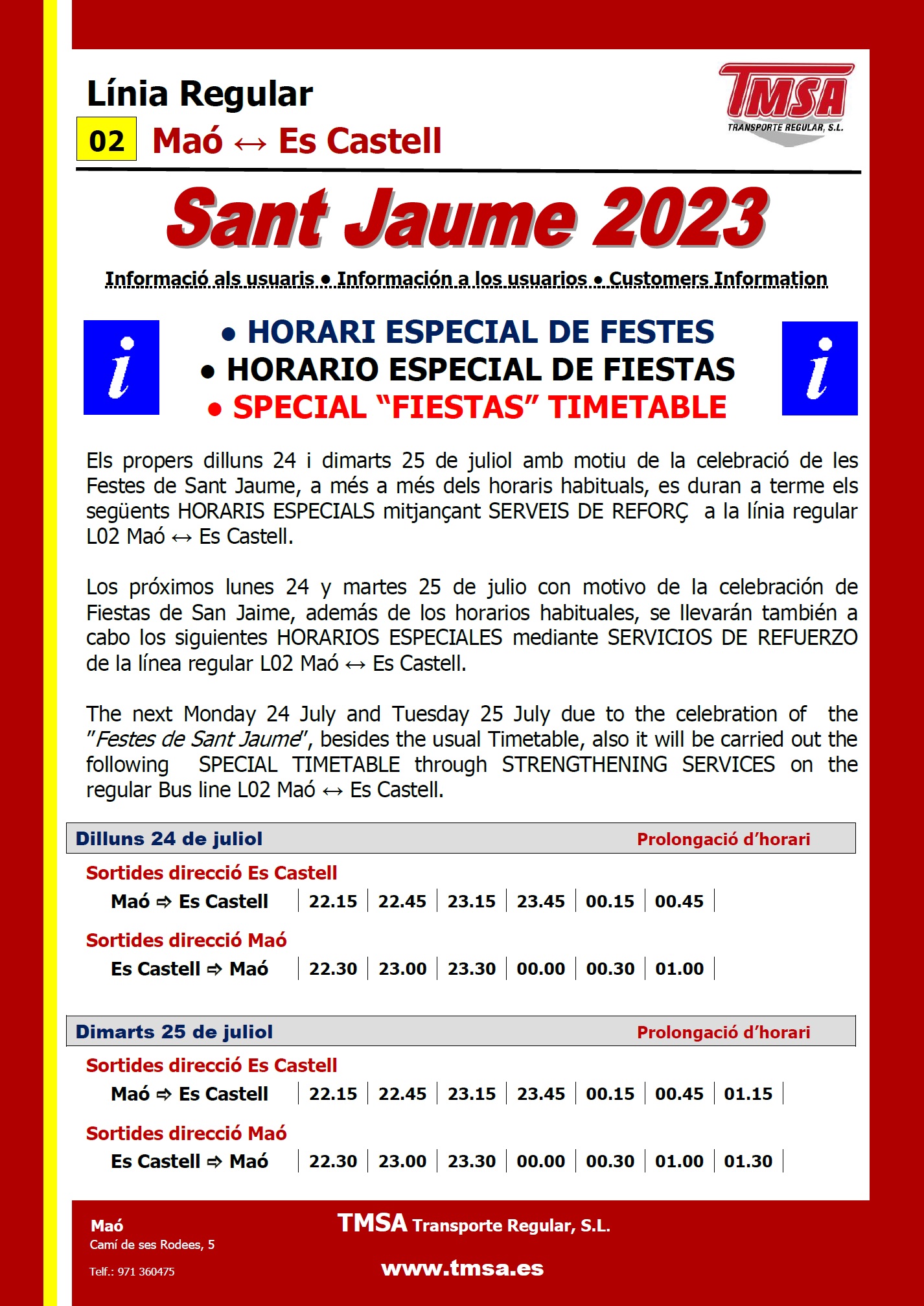 Los próximos lunes 24 y martes 25 de julio con motivo de la celebración de Fiestas de San Jaime, además de los horarios habituales, se llevarán también a cabo HORARIOS ESPECIALES mediante SERVICIOS DE REFUERZO en la línea regular L02 Maó <--> Es Castell.