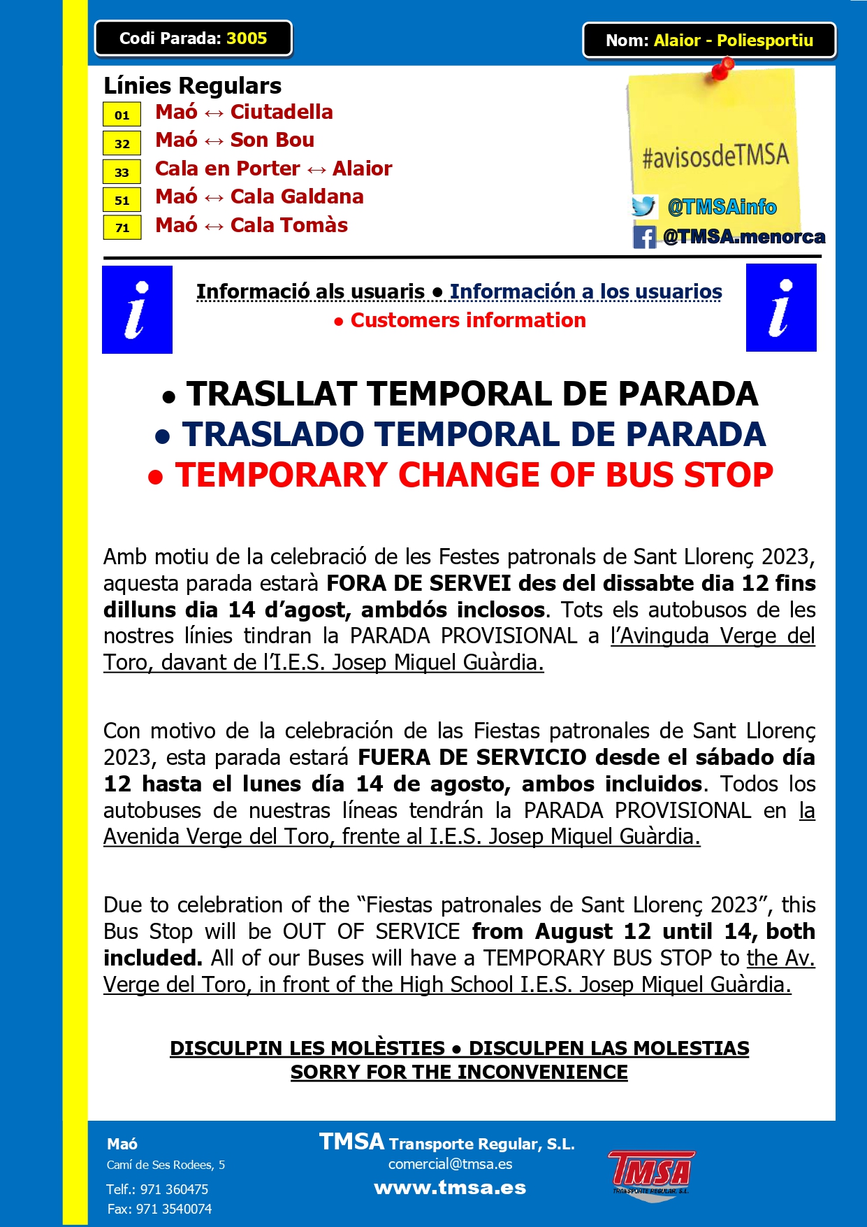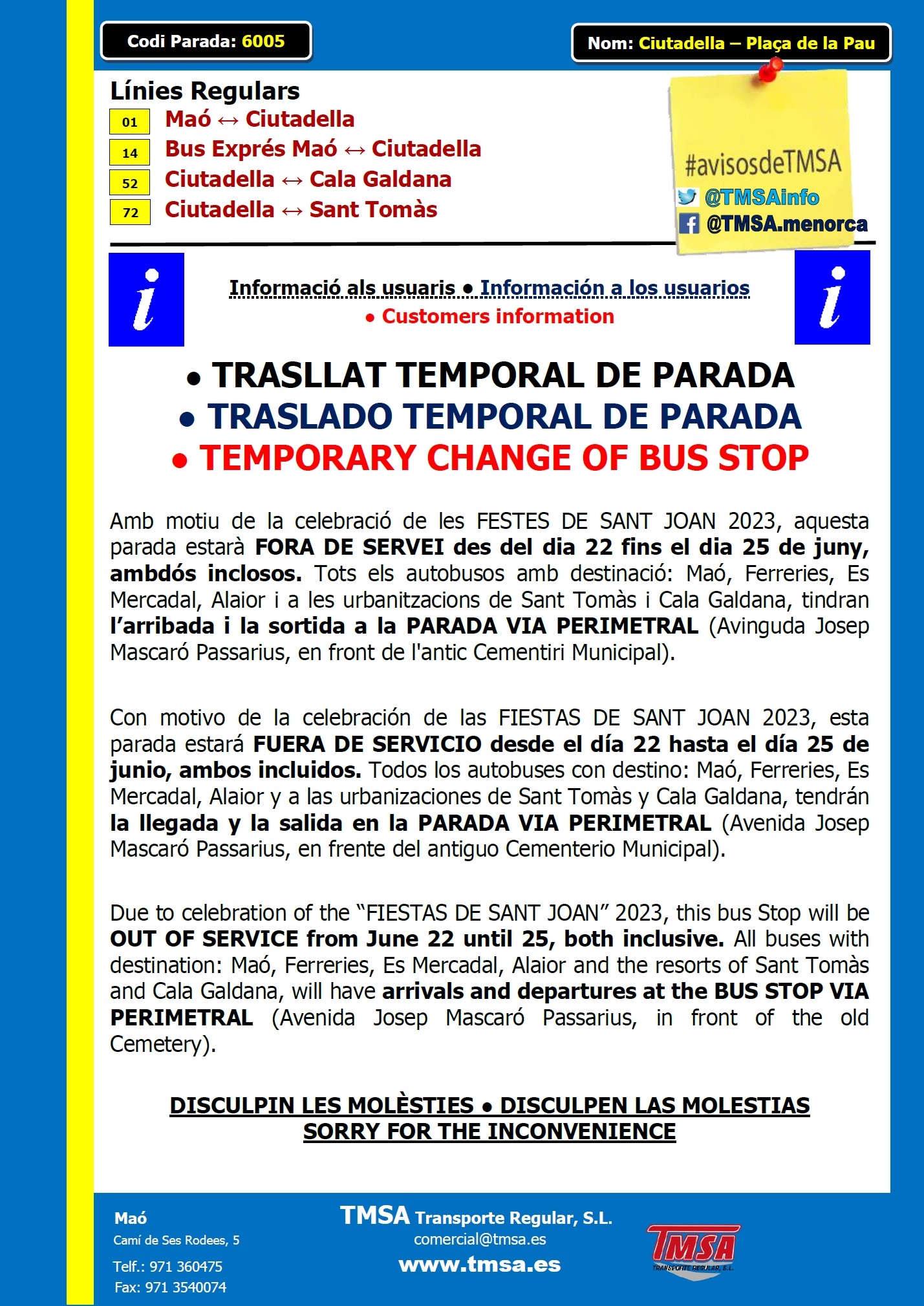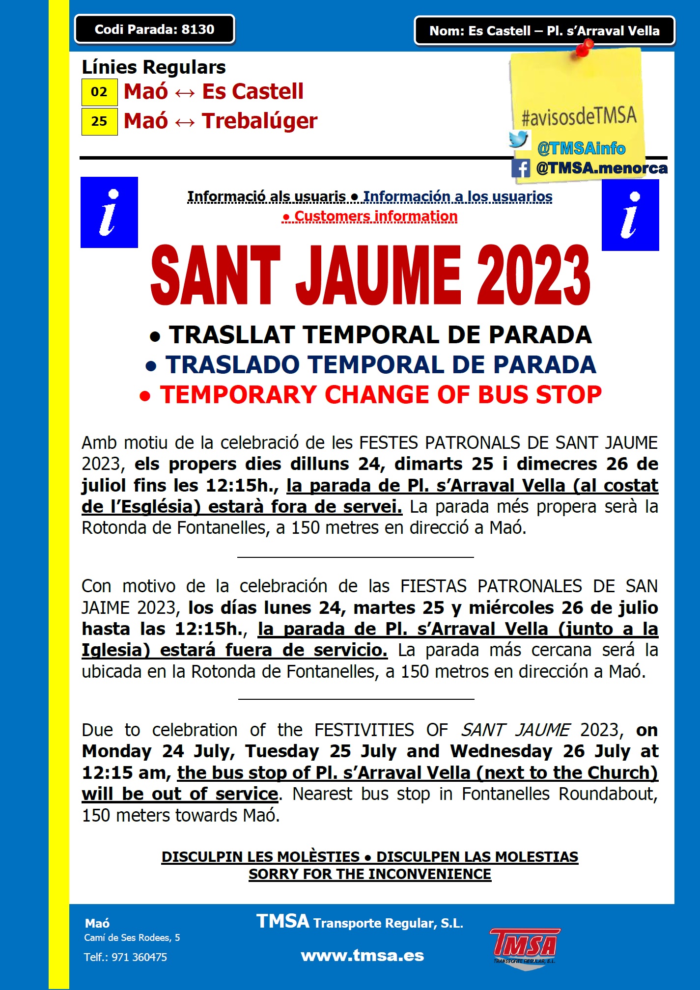 Con motivo de la celebración de las FIESTAS PATRONALES DE SAN JAIME 2023, los días lunes 24, martes 25 y miércoles 26 de julio hasta las 12:15h., la parada de Pl. s’Arraval Vella (junto a la Iglesia) estará fuera de servicio. La parada más cercana será la ubicada en la Rotonda de Fontanelles, a 150 metros en dirección a Maó.