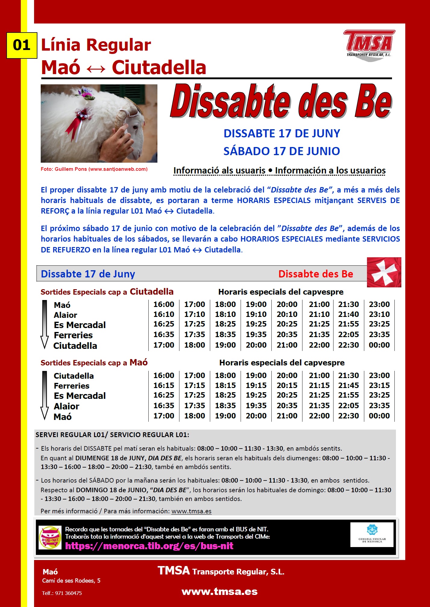 El próximo sábado 17 de Junio, con motivo de la celebración del ”Dissabte des Be”, además de los horarios habituales de los sábados se llevarán a cabo HORARIOS ESPECIALES mediante SERVICIOS DE REFUERZO de la línea regular L01 Maó <----> Ciutadella.