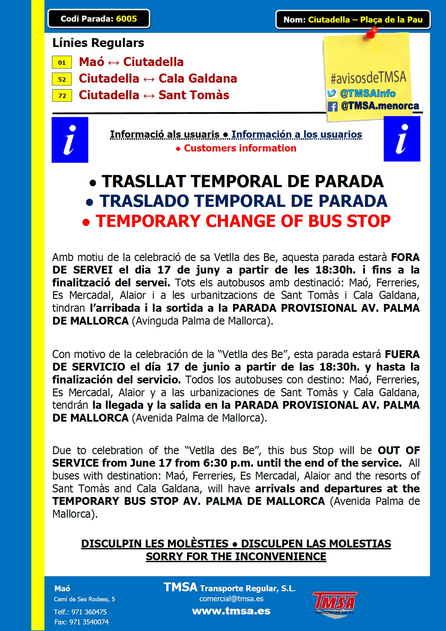 Con motivo de la celebración de la “Vetlla des Be”, las paradas Vía Perimetral y Plaza de la Pau estarán FUERA DE SERVICIO el día 17 de junio a partir de las 18:30h. y hasta la finalización del servicio. Todos los autobuses con destino: Maó, Ferreries, Es Mercadal, Alaior y a las urbanizaciones de Sant Tomàs y Cala Galdana, tendrán la llegada y la salida en la PARADA PROVISIONAL AV. PALMA DE MALLORCA (Avenida Palma de Mallorca).